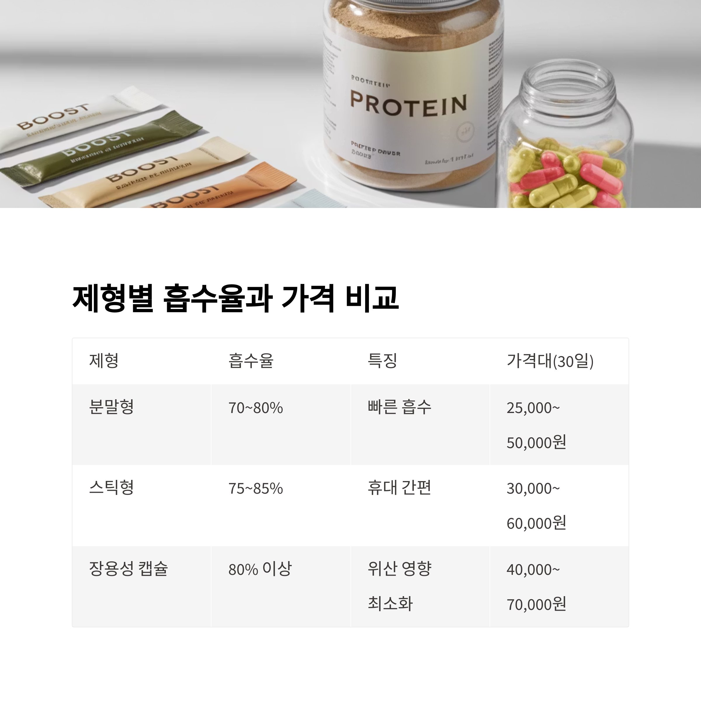 | 제형 | 흡수율 | 특징 | 가격대(30일 기준) |