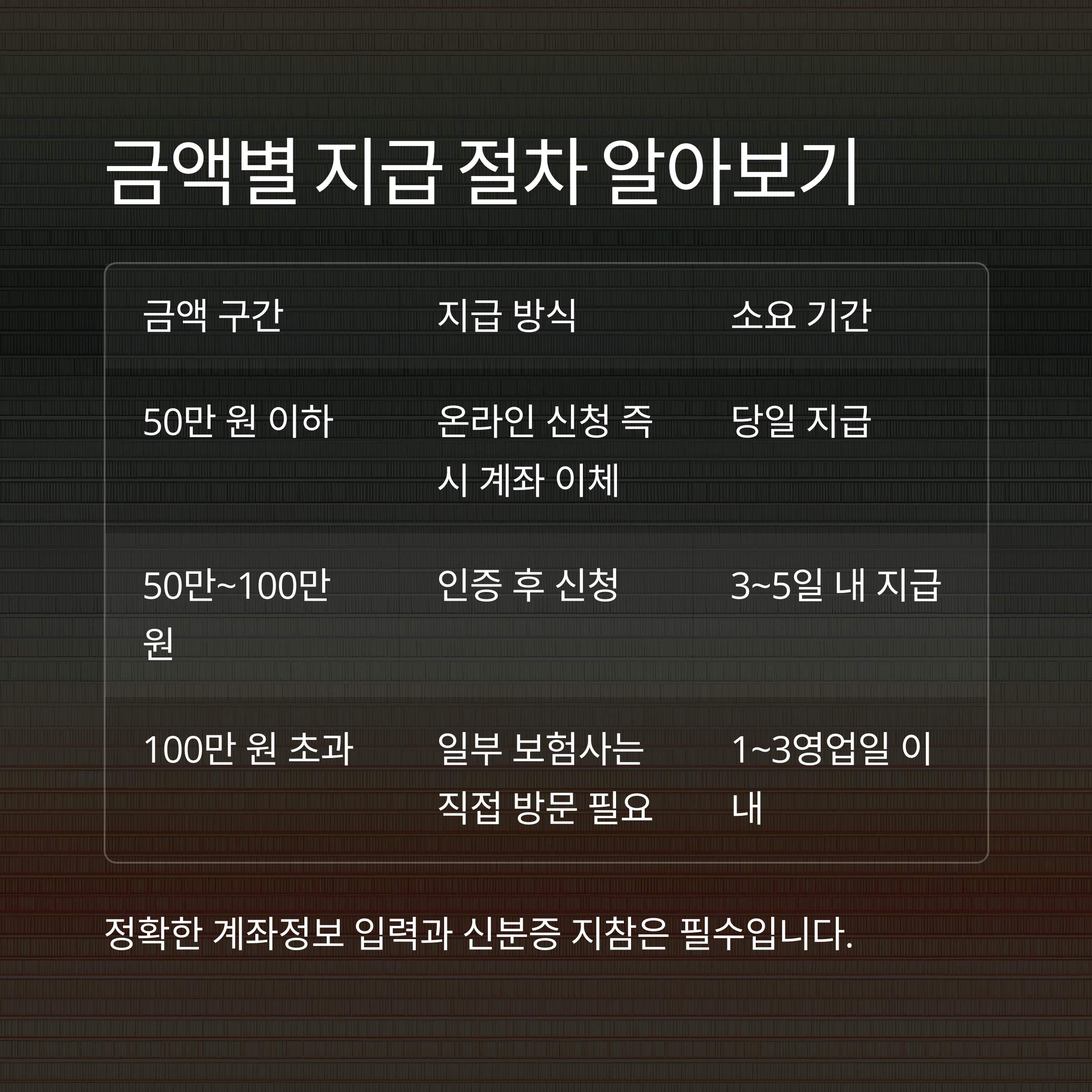 | 100만 원 초과 | 일부 보험사는 직접 방문 필요 | 1~3영업일 이내 |