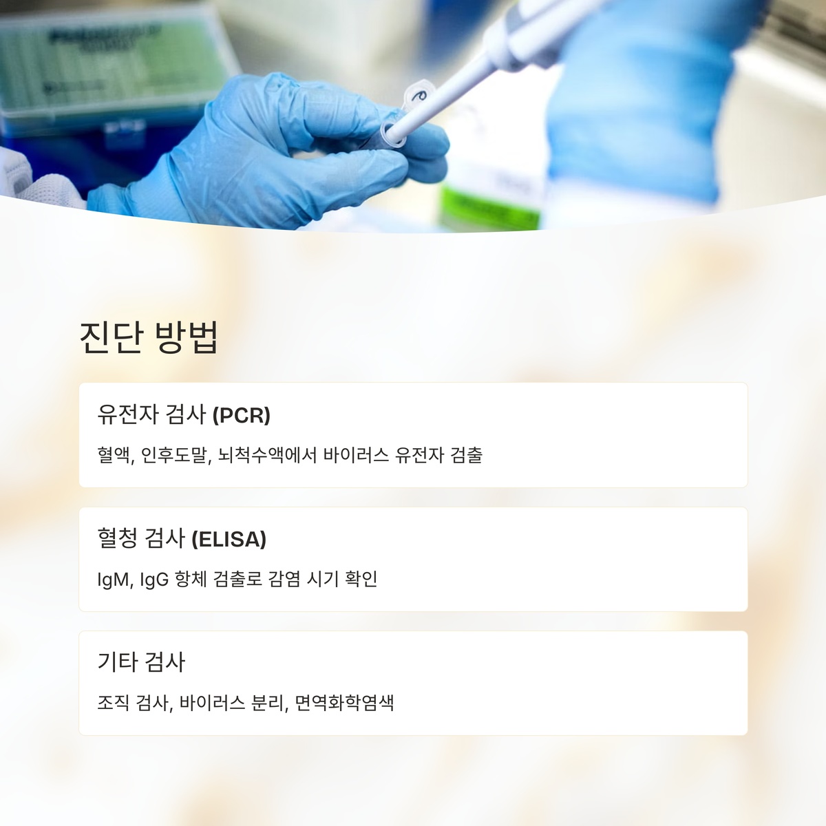 혈액, 인후도말, 뇌척수액 등에서 바이러스 유전자 검출