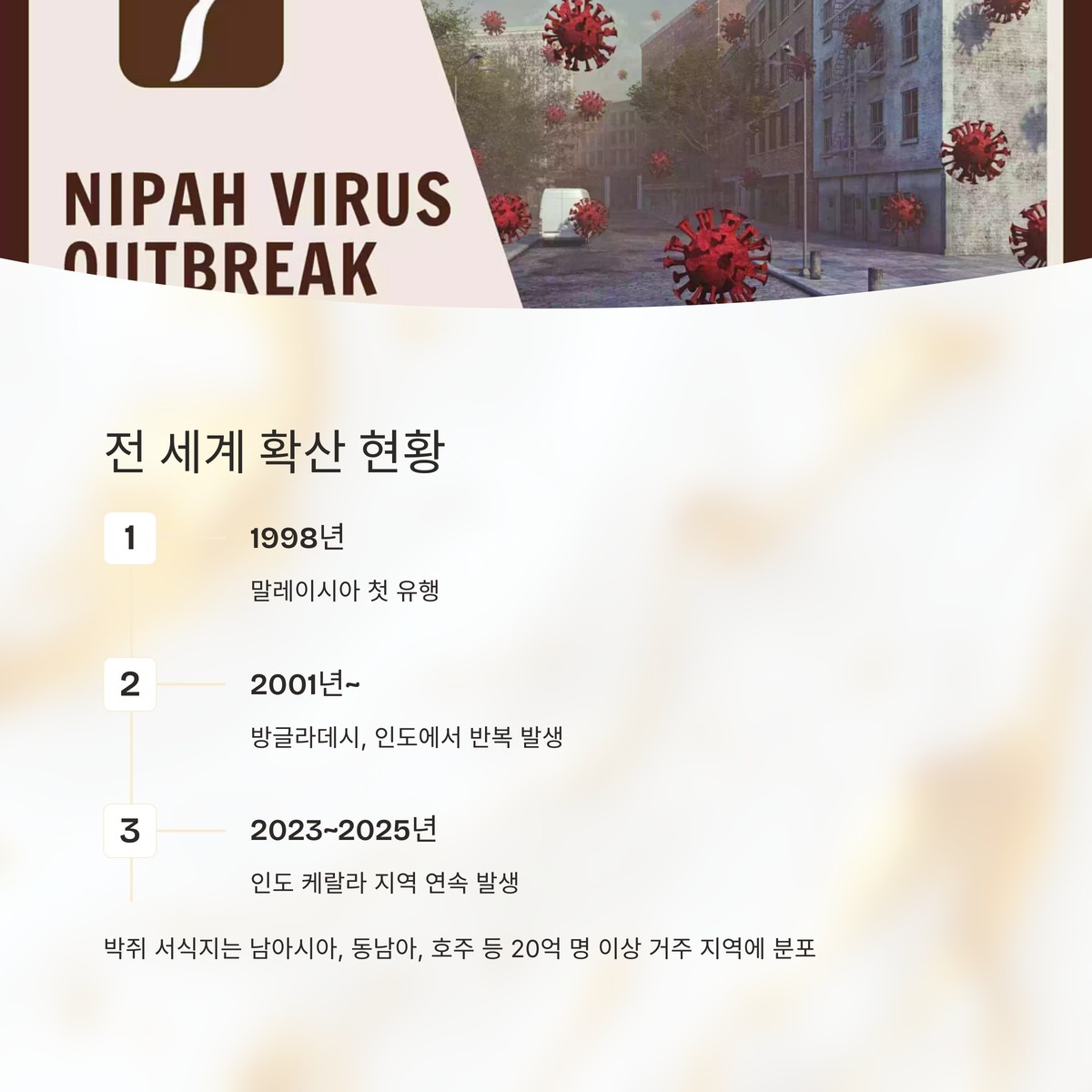 - 1998년 말레이시아 첫 유행 이후 방글라데시, 인도 등에서 반복 발생