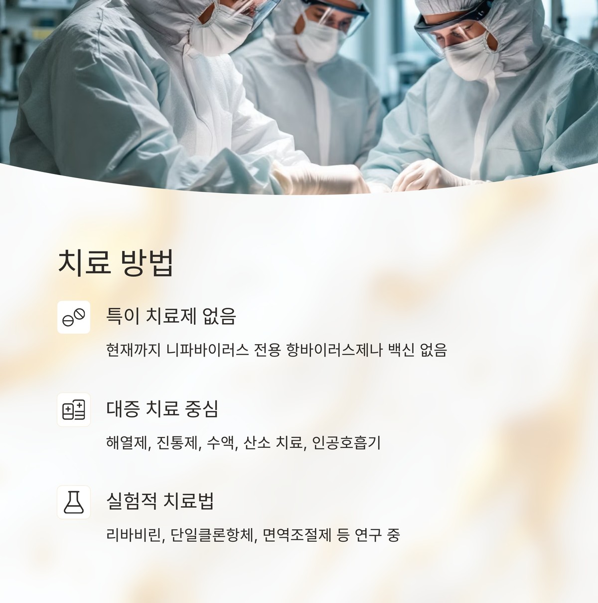 현재까지 니파바이러스 전용 항바이러스제나 백신은 없습니다.