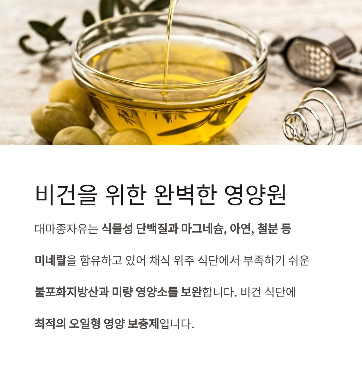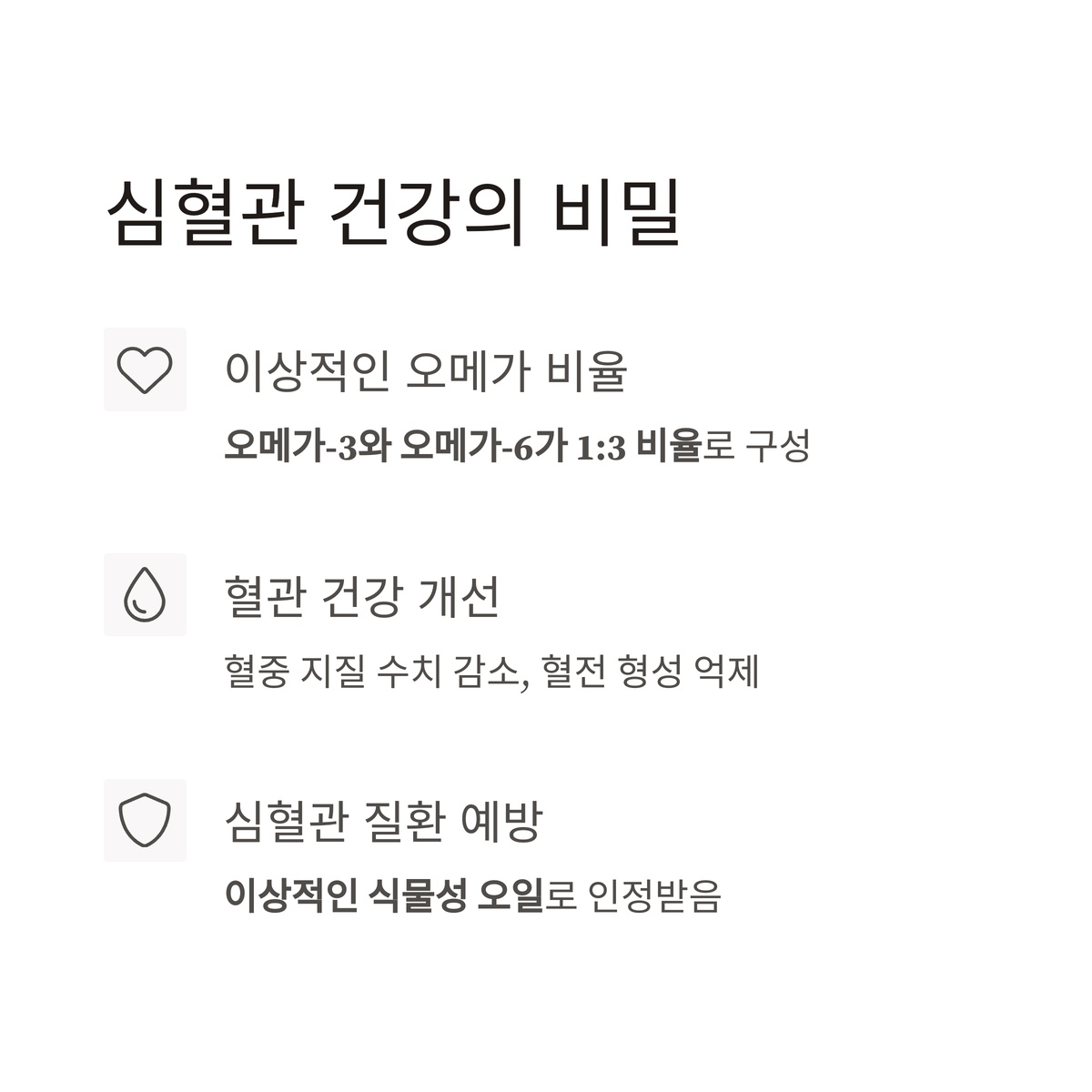 심혈관계 질환 예방에 효과적이라는 연구 결과가 있으며, 특히 혈관 건강을 위한 이상적인 식물성 오일로 꼽힙니다.
