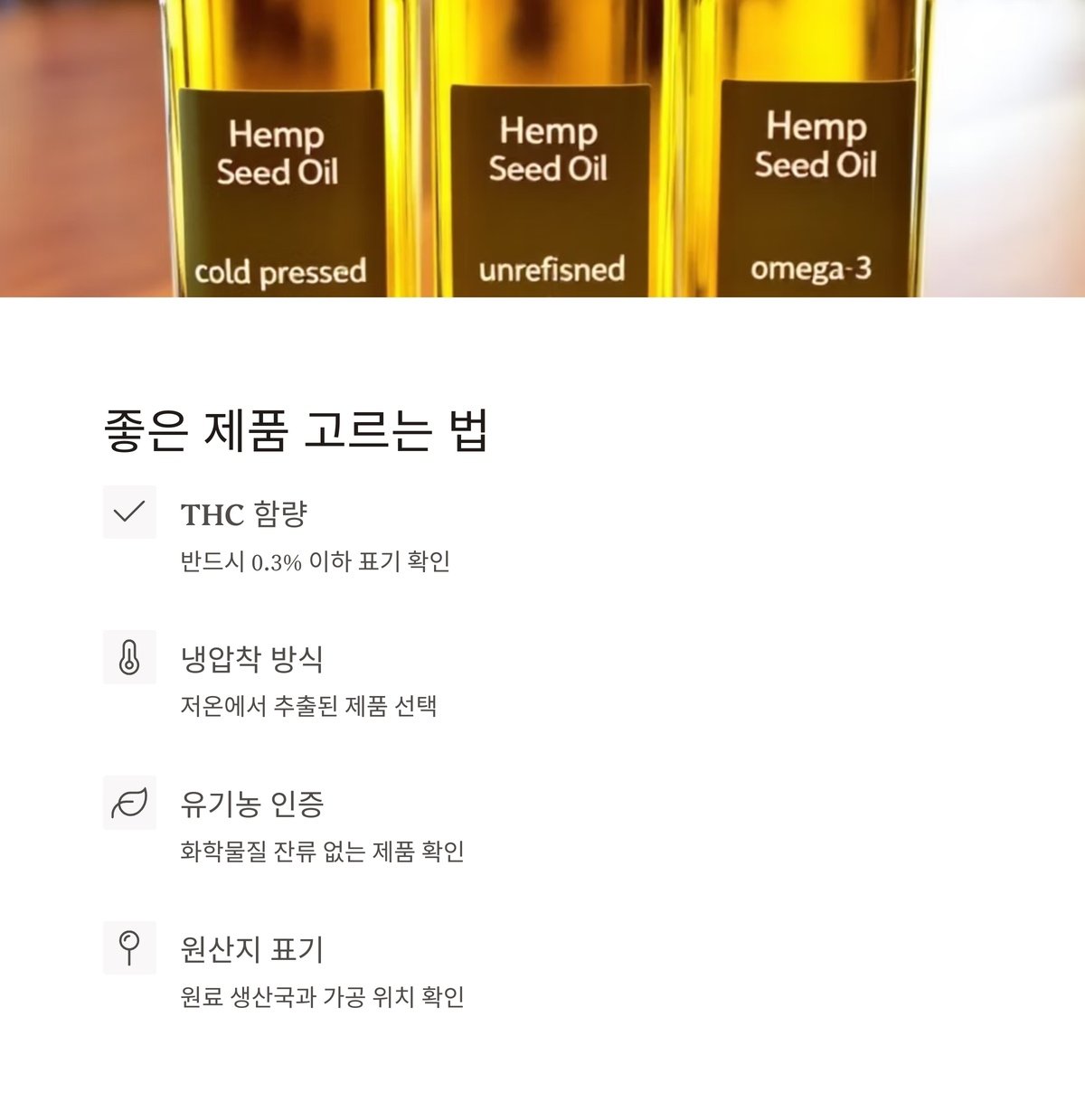 이 네 가지는 대마종자유 구매 시 반드시 확인해야 할 핵심 기준입니다.