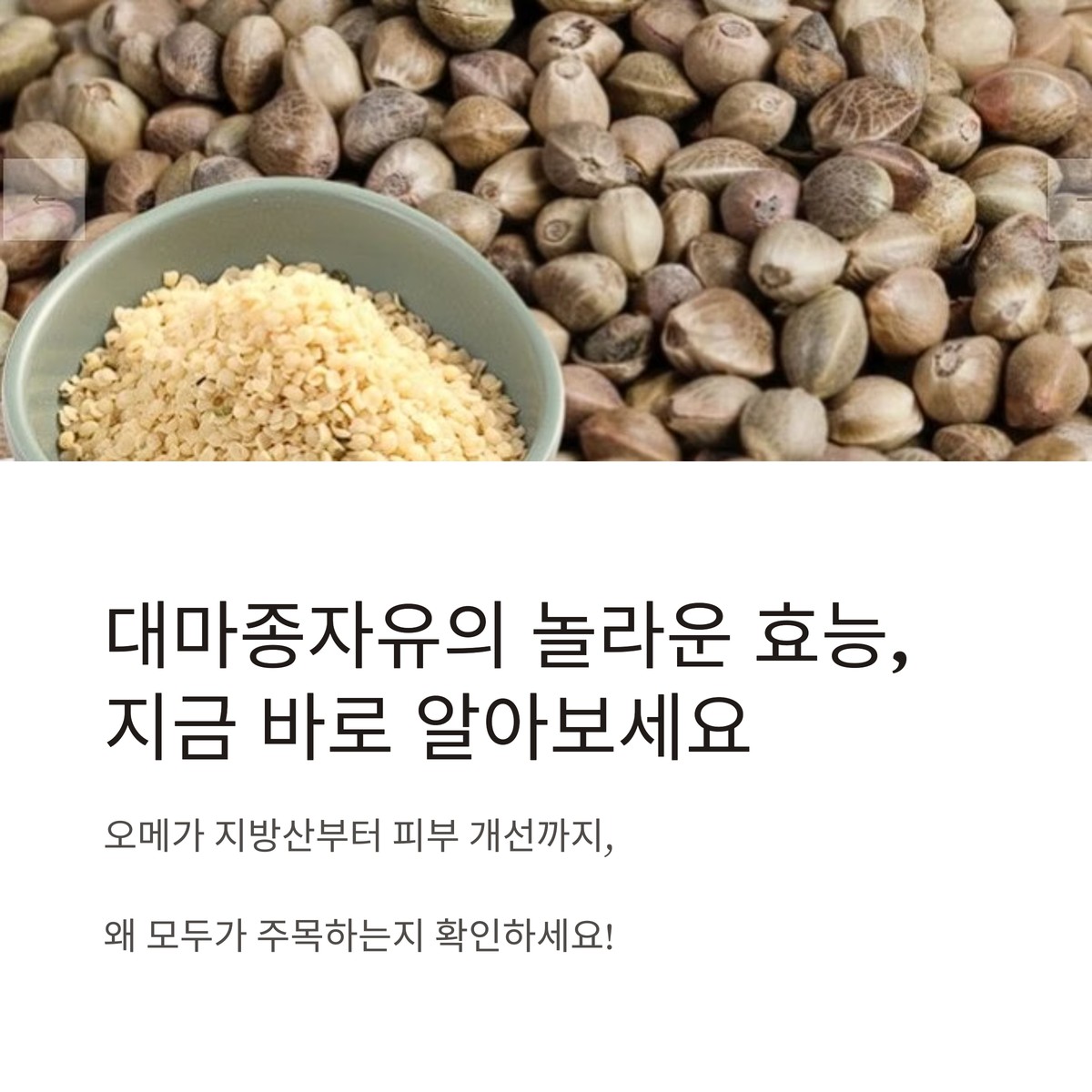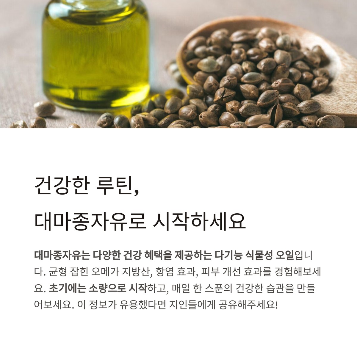 대마종자유는 대마 씨앗을 저온에서 압착해 만든 고영양 식물성 오일로, 정신활성 물질인 THC가 0.3% 이하로 매우 적어 식품으로 안전하게 섭취 가능합니다.
