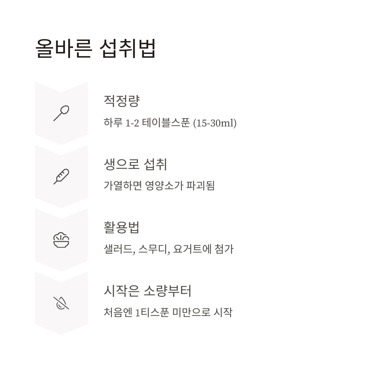 가열하면 영양소가 파괴되므로 조리용 오일로는 적합하지 않으며, 처음 섭취 시에는 1티스푼 미만의 소량으로 시작해 체내 반응을 확인하는 것이 안전합니다.