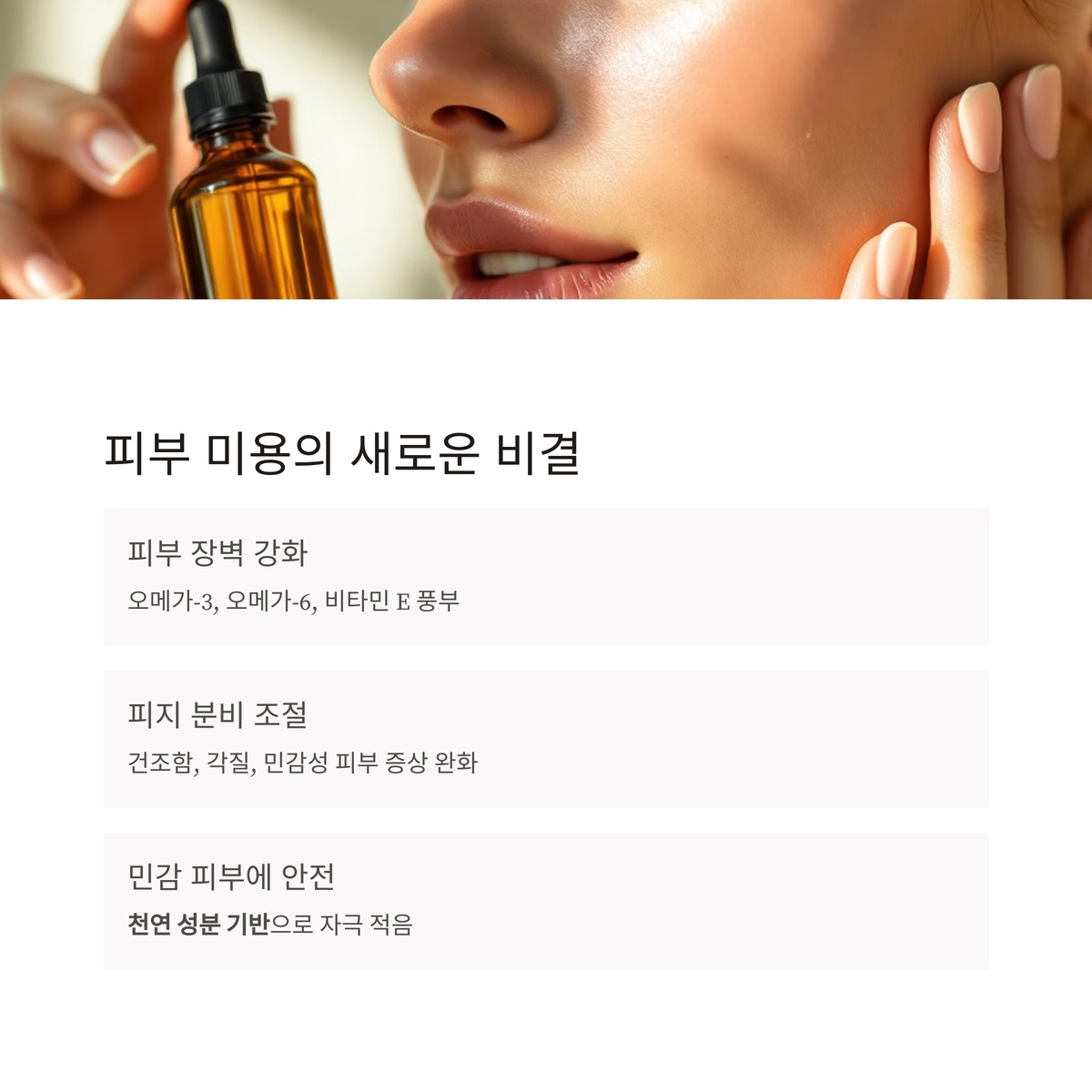 오메가-3, 오메가-6 외에도 비타민 E가 풍부하게 들어 있어 피부 장벽을 강화하고 피지 분비를 조절하며 보습력 유지에 도움을 줍니다.