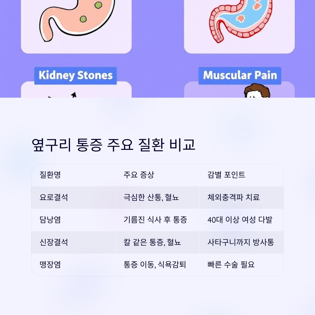 오른쪽 옆구리 통증은 단순히 근육통으로 착각하기 쉽지만, 복부 장기의 염증, 결석, 감염, 바이러스 감염 등 다양한 원인에서 비롯될 수 있습니다. 특히 통증이 갑자기 심해지거나 반복될 경우, 또는 고열, 황달, 혈뇨 등과 함께 나타난다면 반드시 병원 진료를 받아야 합니다.