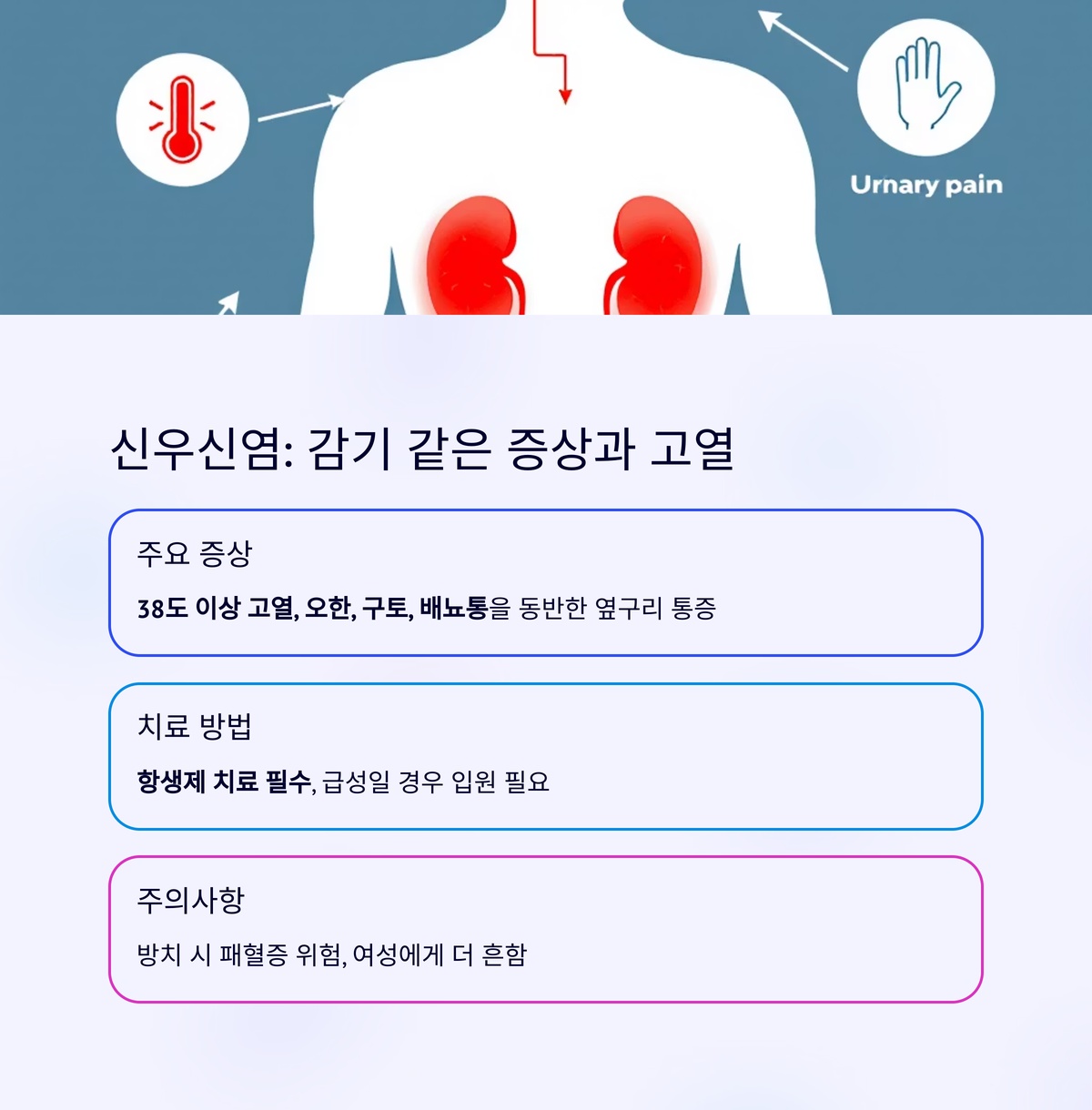 | 신우신염 | 발열, 오한, 옆구리 통증 | 항생제 치료, 입원 치료 필요 가능성 |