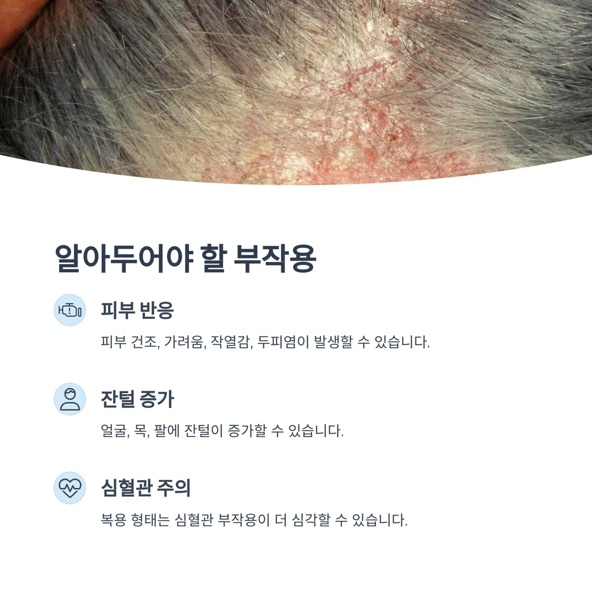 복용 형태의 미녹시딜은 부작용이 훨씬 심각할 수 있으므로, 심혈관 질환 이력이 있다면 반드시 전문 상담을 받아야 합니다.