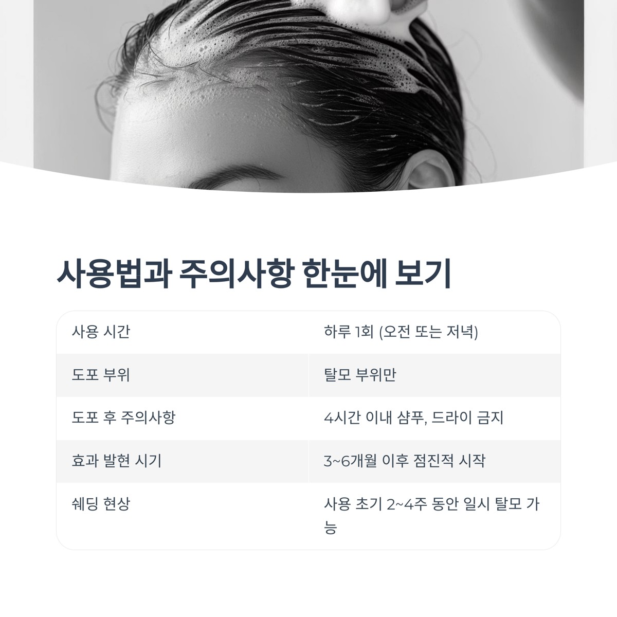 핵심은 매일 같은 시간에 1g씩, 탈모 부위에만 바른다는 점입니다.
