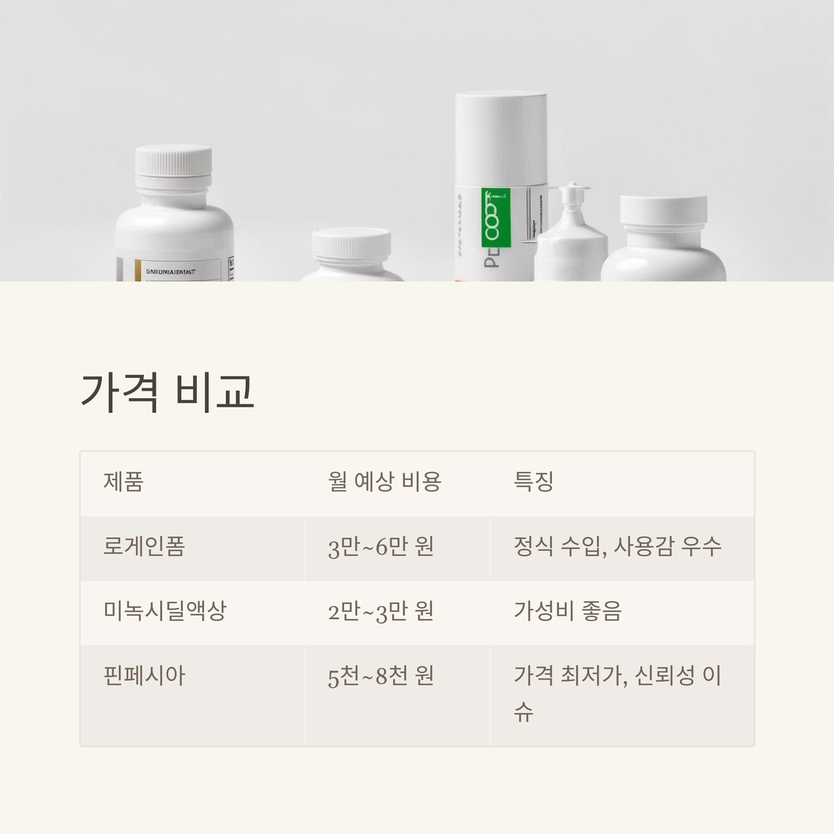 | 미녹시딜액상 | 2만~3만 원 | 국내외 브랜드 다양, 가성비 좋음 |