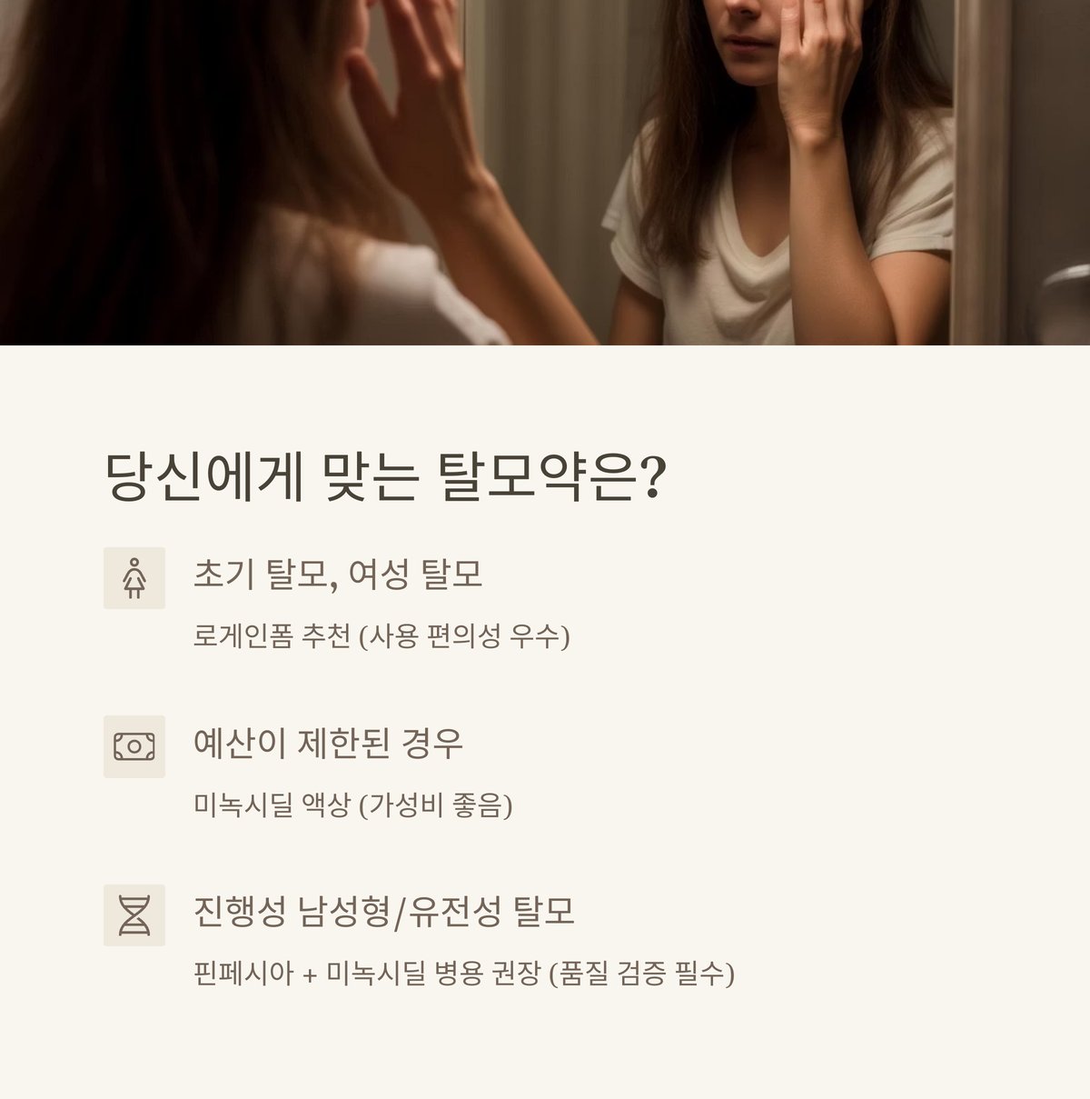 - 초기 탈모, 여성 탈모 또는 사용 편의성 중요 시: 로게인폼 추천