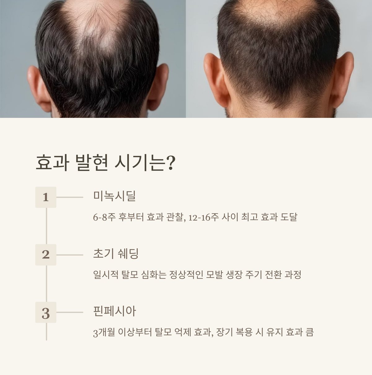 두 약물 모두 일시적 쉐딩(초기 탈모 심화) 현상이 있을 수 있으나