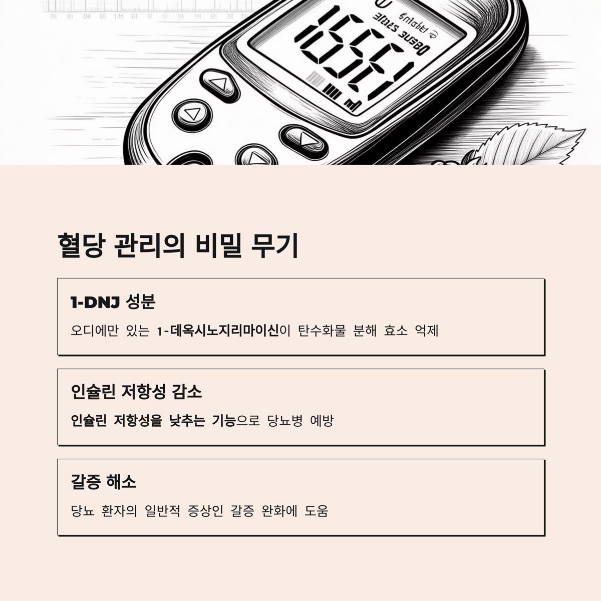 오디에만 있는 1-DNJ(1-데옥시노지리마이신)는 탄수화물 분해 효소를 억제해 식후 혈당 상승을 막고 인슐린 저항성을 낮추는 기능으로 당뇨병 예방에 탁월합니다.