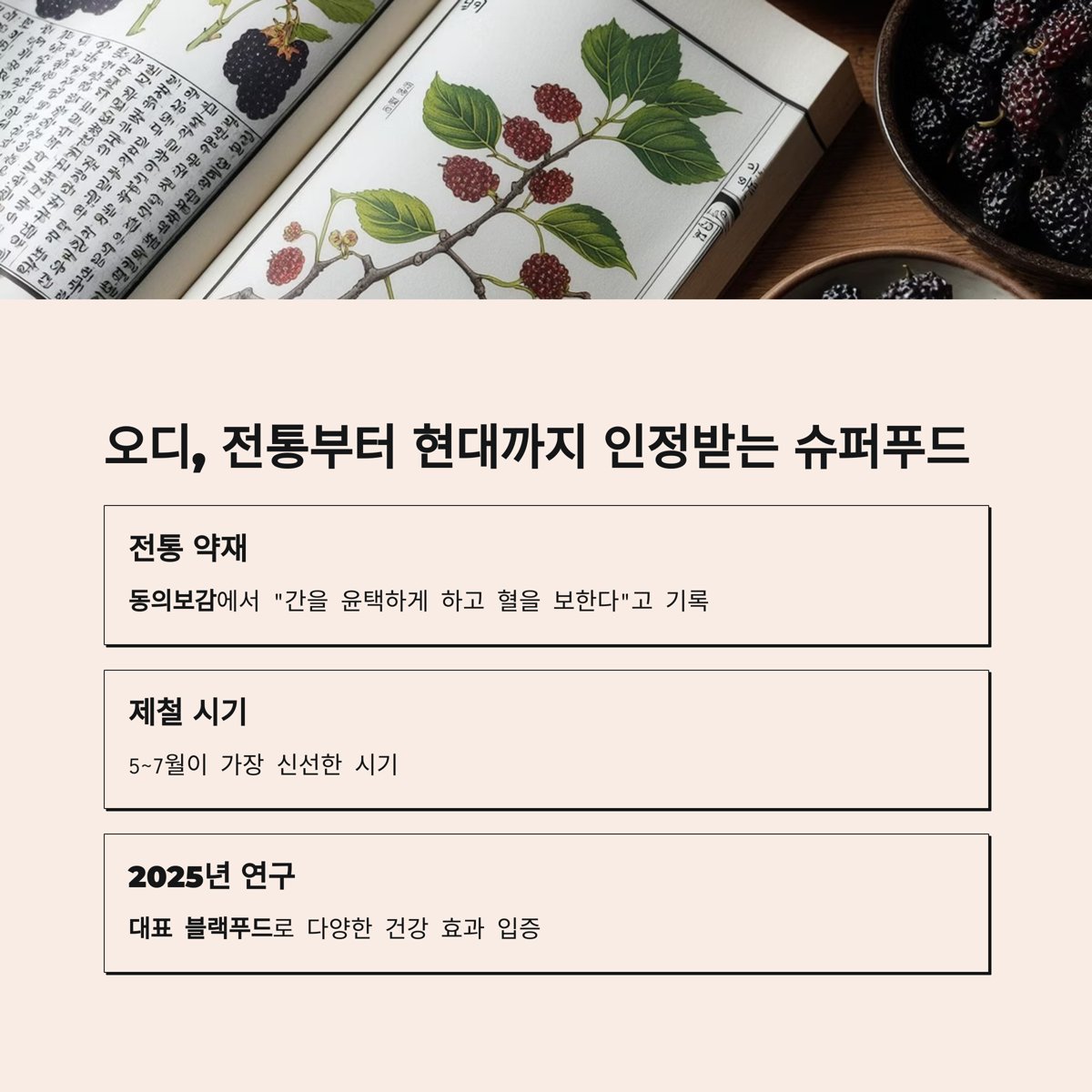 2025년 최신 연구에 따르면 오디는 항산화, 면역 증진, 당뇨 예방, 심혈관 건강 등 다양한 건강 효과를 가진 대표 블랙푸드입니다.