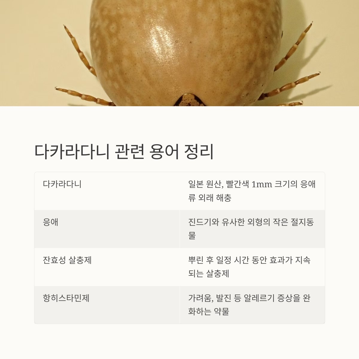| 응애 | 진드기와 유사한 외형의 작은 절지동물, 대부분 해를 끼치지 않음 |