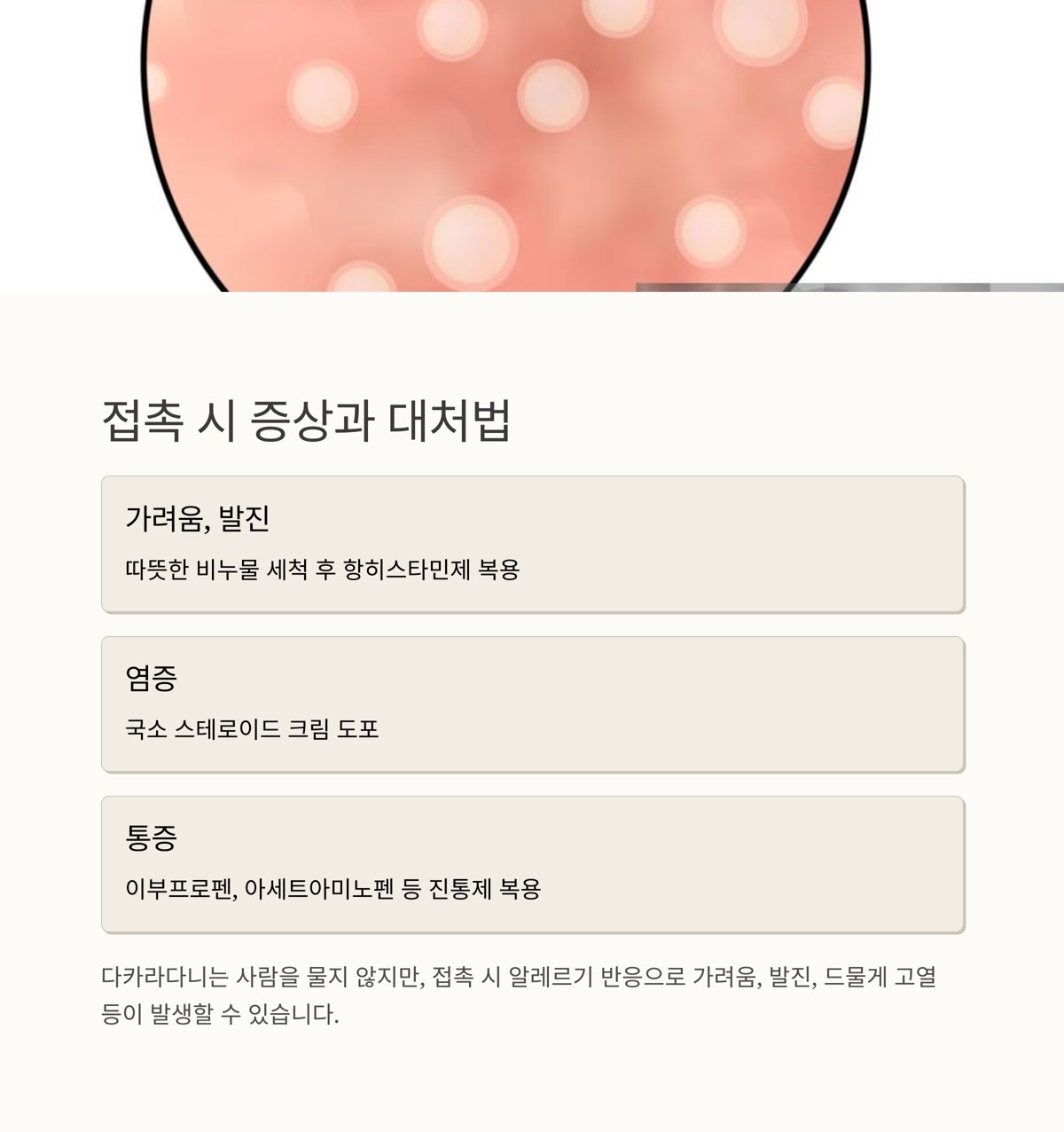 | 가려움, 발진 | 따뜻한 비누물 세척 후 항히스타민제 복용 |