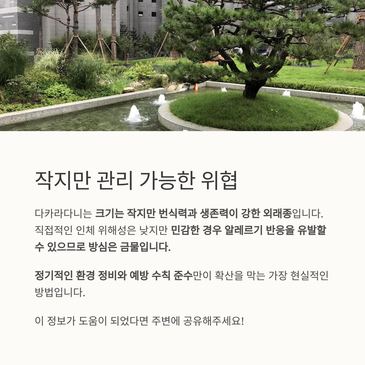 2025년 5월, 청주시에서는 다카라다니 대량 출몰로 방역당국이 2차례 방역을 실시했습니다.