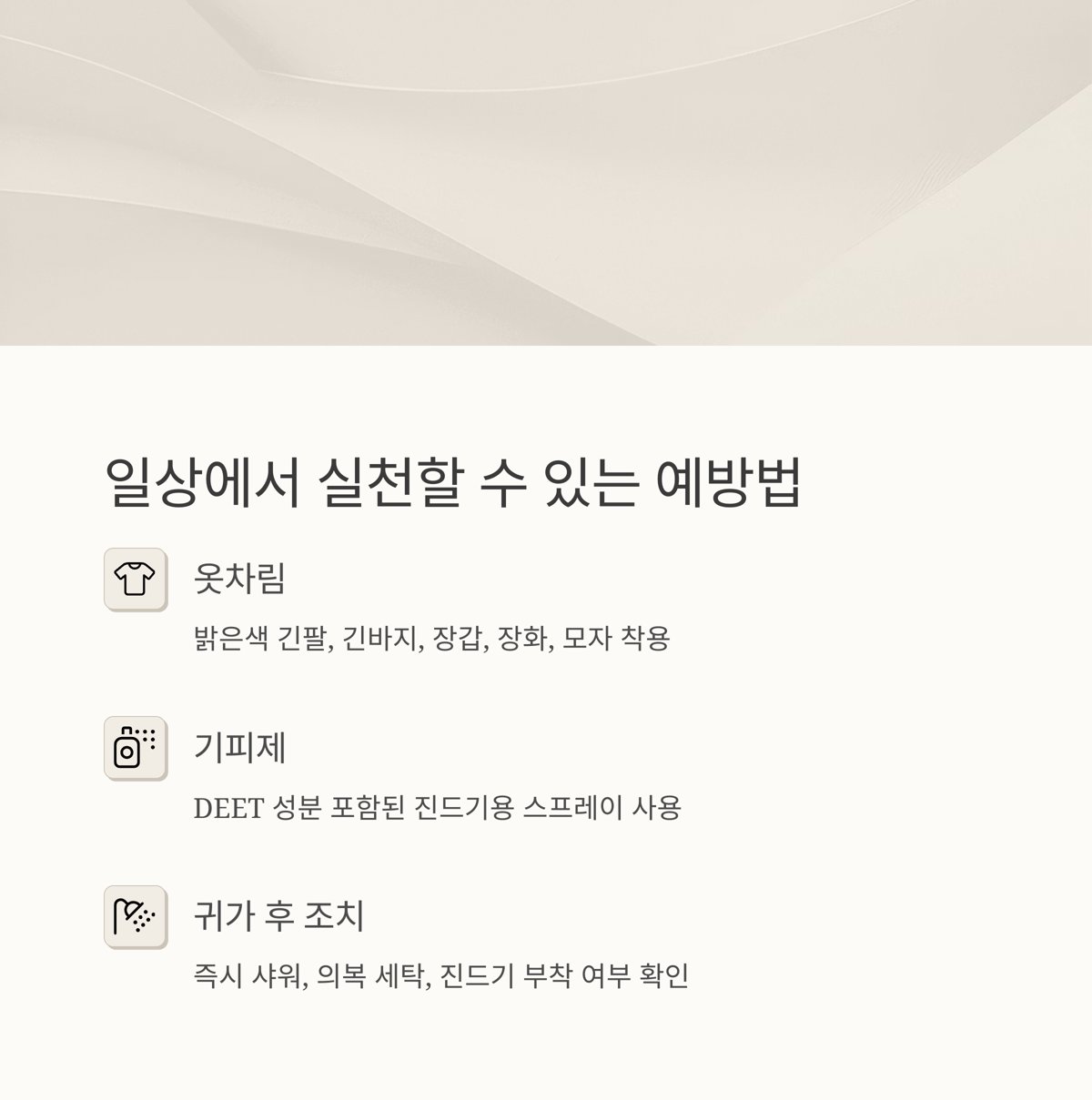 | 귀가 후 조치 | 즉시 샤워, 의복 세탁, 진드기 부착 여부 확인 |