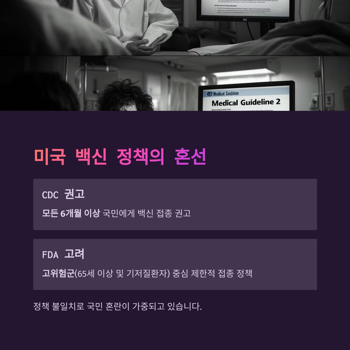 2025년 현재, 미국 CDC는 모든 6개월 이상 국민에게 백신 접종을 권고하고 있으나 FDA는 고위험군(65세 이상 및 기저질환자) 중심으로 제한된 접종 정책을 고려하며 정책 불일치로 인한 국민 혼란이 가중되고 있습니다.