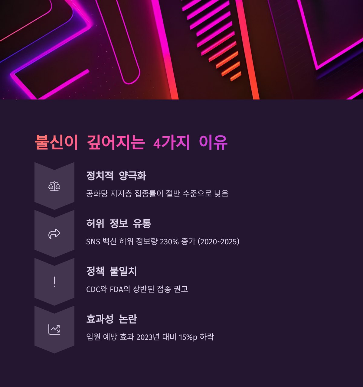 2025년 들어 미국 내 백신 접종률은 눈에 띄게 낮아졌으며, 이는 단순한 정보 부족이 아니라 정치적·사회적 요인과 정책 변화에 따른 영향이 큽니다.
