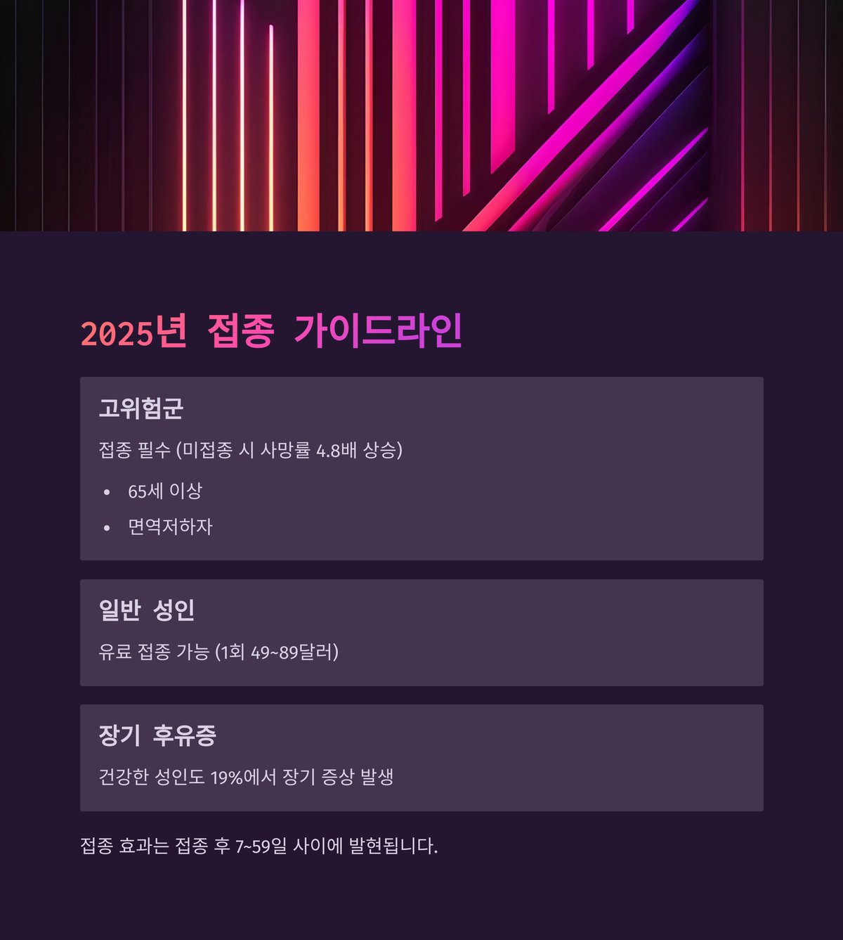 | 고위험군(65세 이상, 면역저하자) | 접종 필수, 미접종 시 사망률 4.8배 상승 |