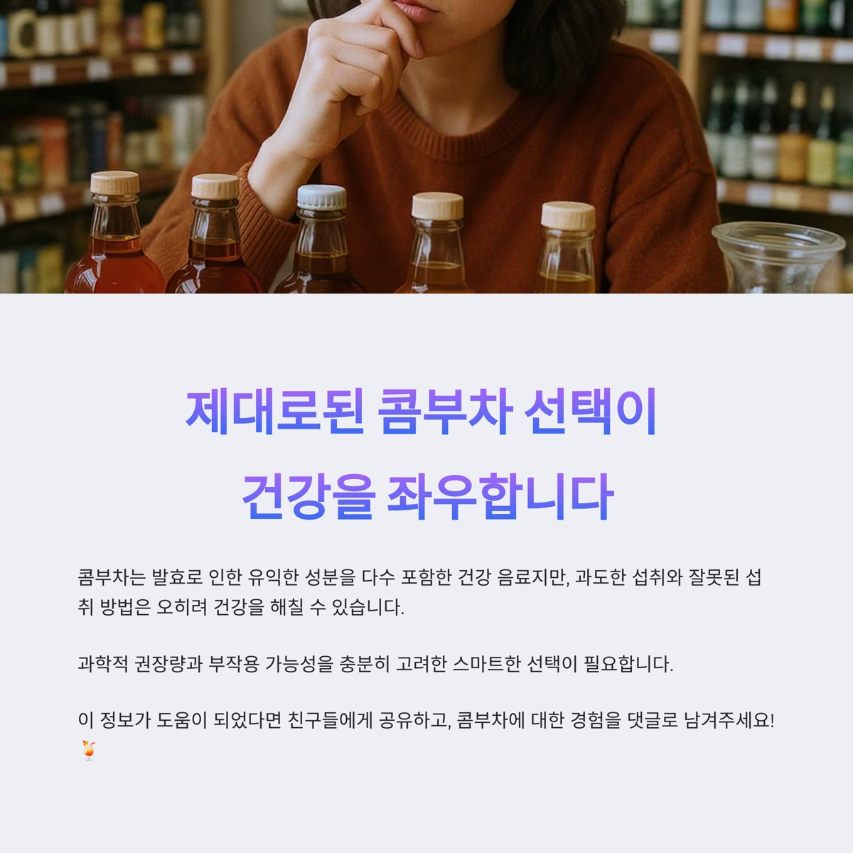 콤부차는 발효로 인한 유익한 성분을 다수 포함한 건강 음료지만 과도한 섭취, 잘못된 제조 및 섭취 시간 선택은 건강을 해칠 수 있습니다