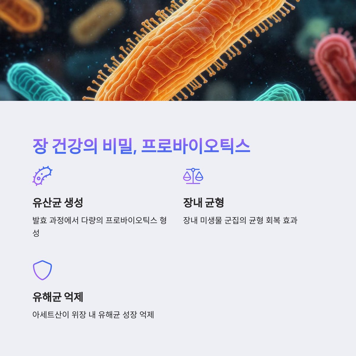 특히 발효 중 생성된 아세트산은 위장 내 유해균 성장을 억제해 장내 환경을 더욱 건강하게 유지시켜 줍니다