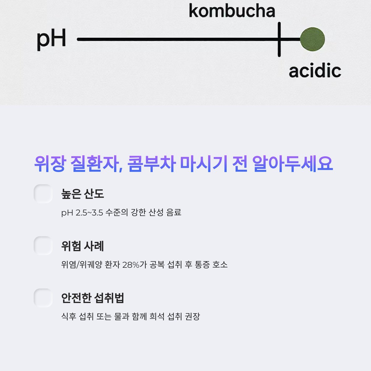 콤부차는 pH 2.5~3.5 수준의 산성 음료로 분류됩니다
