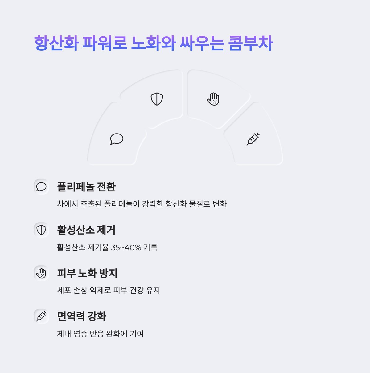 홍차 또는 녹차에서 추출된 폴리페놀은 발효 중 강력한 항산화 물질로 전환되며 활성산소 제거율 35~40%를 보입니다