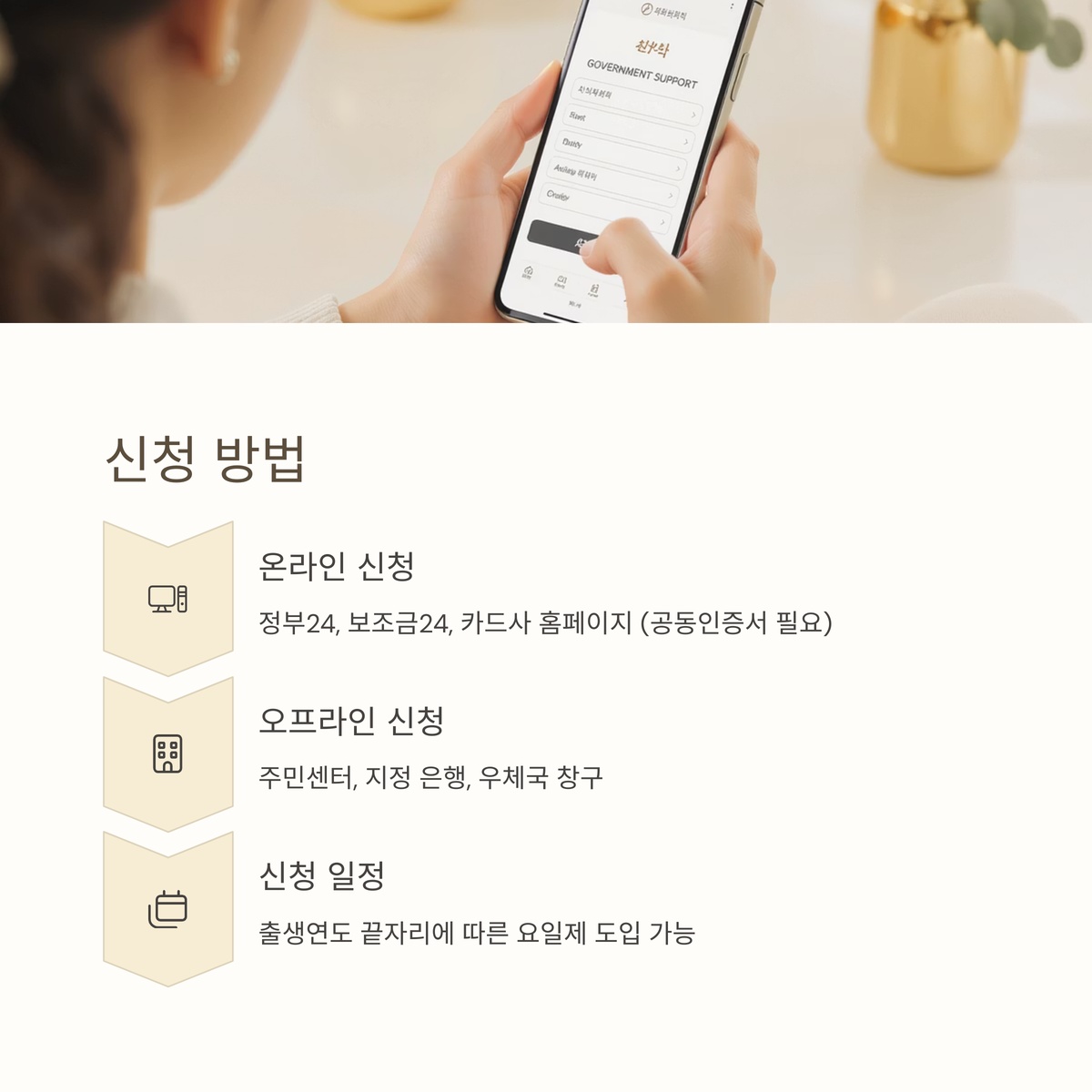 온라인은 정부24, 보조금24, 카드사 홈페이지 등에서 공동인증서 또는 간편인증으로 신청합니다.