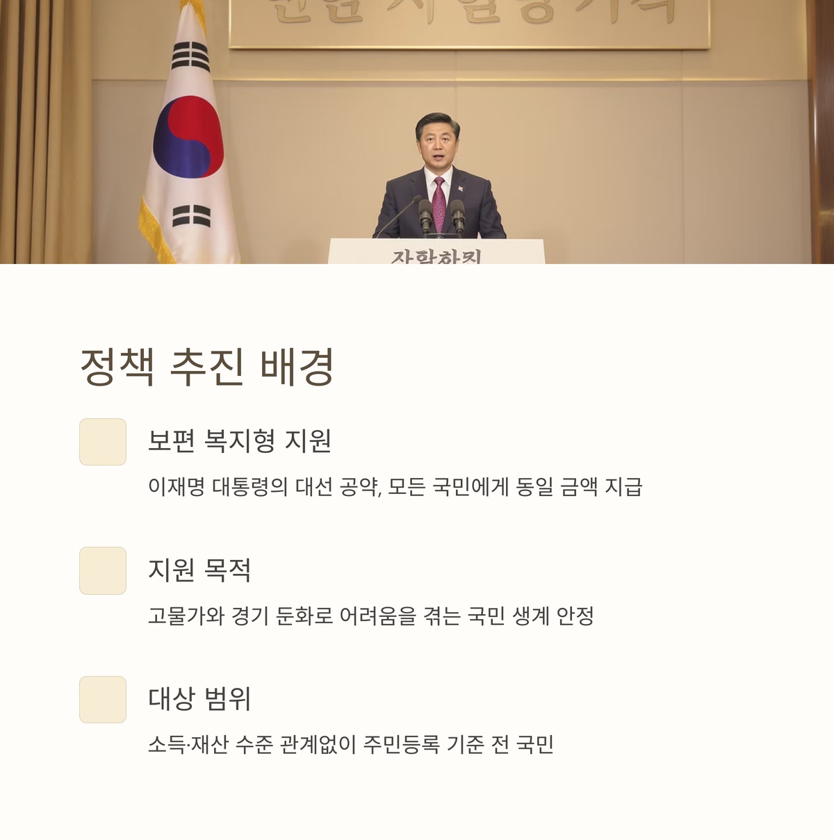 이재명 대통령의 대선 공약이기도 한 이 정책은 모든 국민에게 동일 금액을 지급하는 보편 복지형 지원금입니다.
