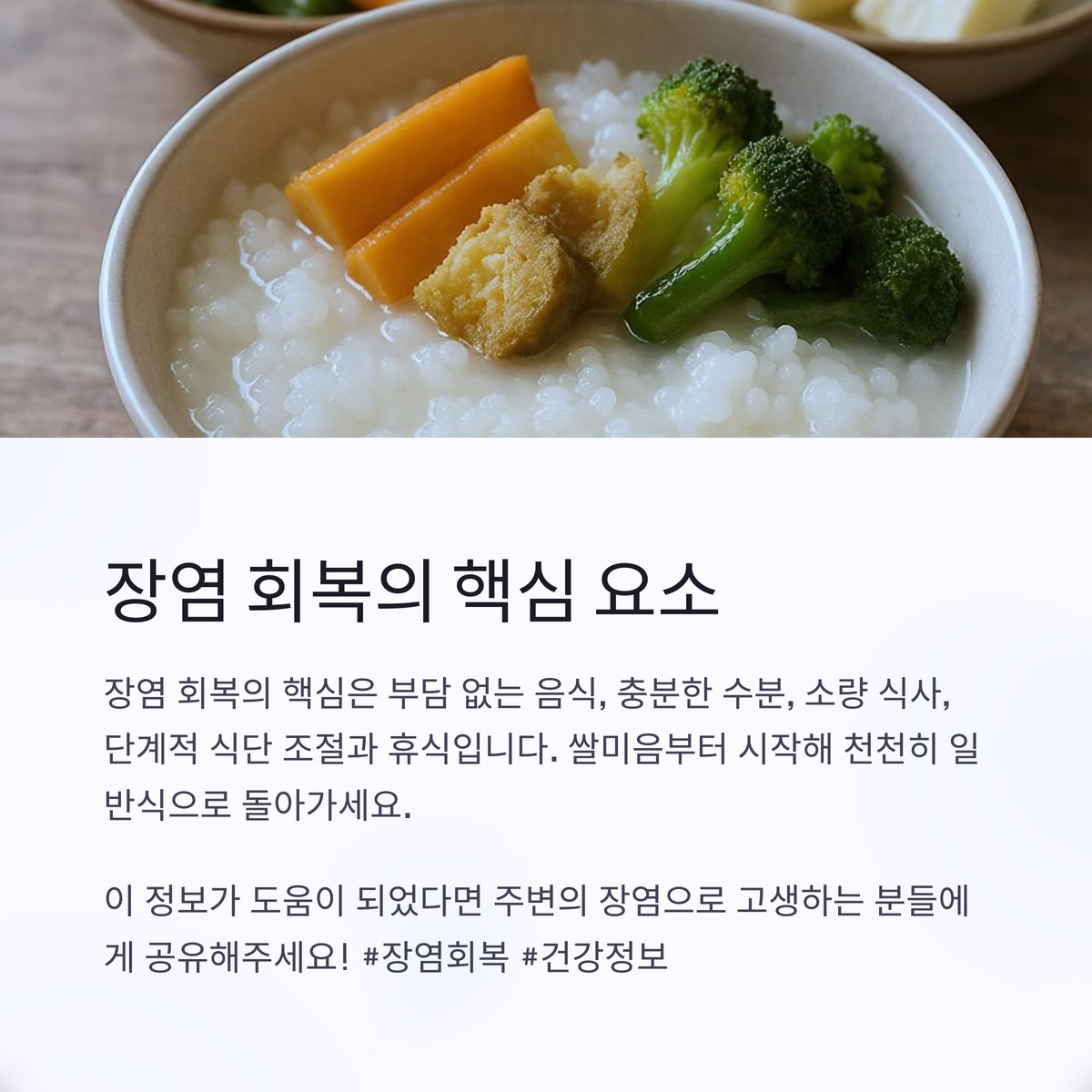 장염은 위장에 부담이 적은 음식과 충분한 수분 섭취, 소량씩 자주 식사, 그리고 단계적 식단 조절과 휴식이 회복의 핵심입니다. 쌀미음, 쌀죽, 삶은 감자와 당근, 된장죽, 계란, 두부, 흰살생선, 바나나, 익힌 채소, 매실차 등은 회복에 도움을 주며, 기름진 음식, 매운 음식, 유제품, 생채소, 커피, 알코올 등은 반드시 피해야 합니다.