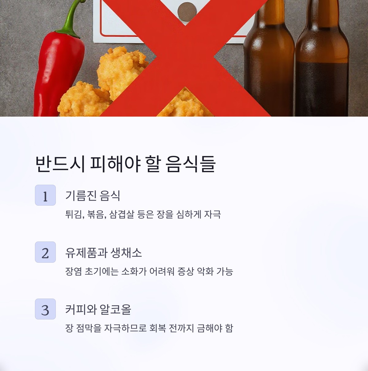 기름진 음식, 튀김, 볶음, 매운 음식, 삼겹살 등은 장을 심하게 자극하므로 절대 피해야 합니다. 유제품과 생채소 역시 장염 초기에는 소화가 어려워 증상을 악화시킬 수 있습니다.