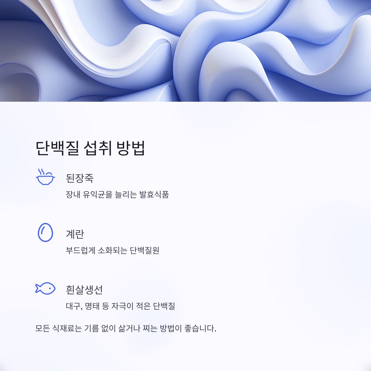 된장은 장내 유익균을 늘리는 발효식품입니다. 계란, 두부, 흰살생선(대구, 명태 등)은 자극이 적고 부드럽게 소화되어 장염 회복기에 적합합니다.