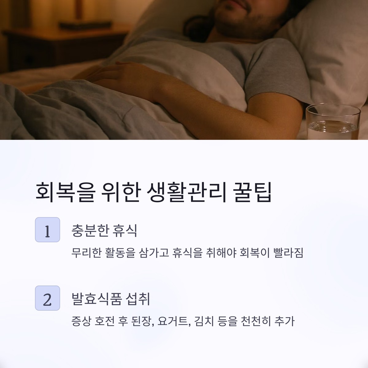 무리한 활동을 삼가고 충분히 휴식을 취해야 회복이 빨라집니다. 증상이 호전된 이후에는 된장, 요거트, 김치 등 발효식품을 천천히 추가하면 장내 유익균 균형을 회복하는 데 도움이 됩니다.