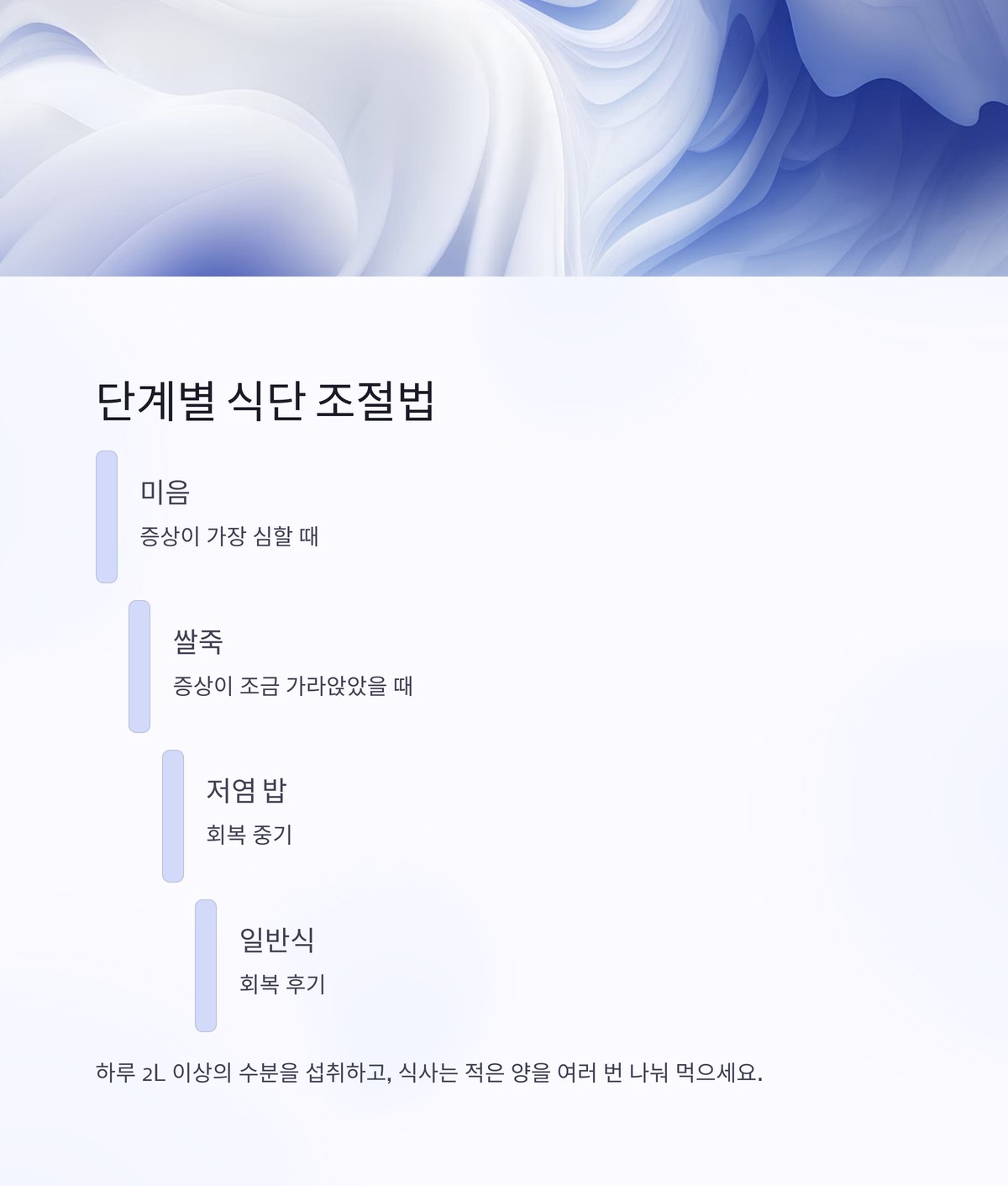 증상이 심할 때는 미음, 그다음 쌀죽, 이후 저염 밥, 일반식 순서로 식단을 조절해야 합니다. 하루 2L 이상의 수분을 섭취하며, 전해질 음료나 이온음료를 소량씩 자주 마시는 것이 중요합니다.