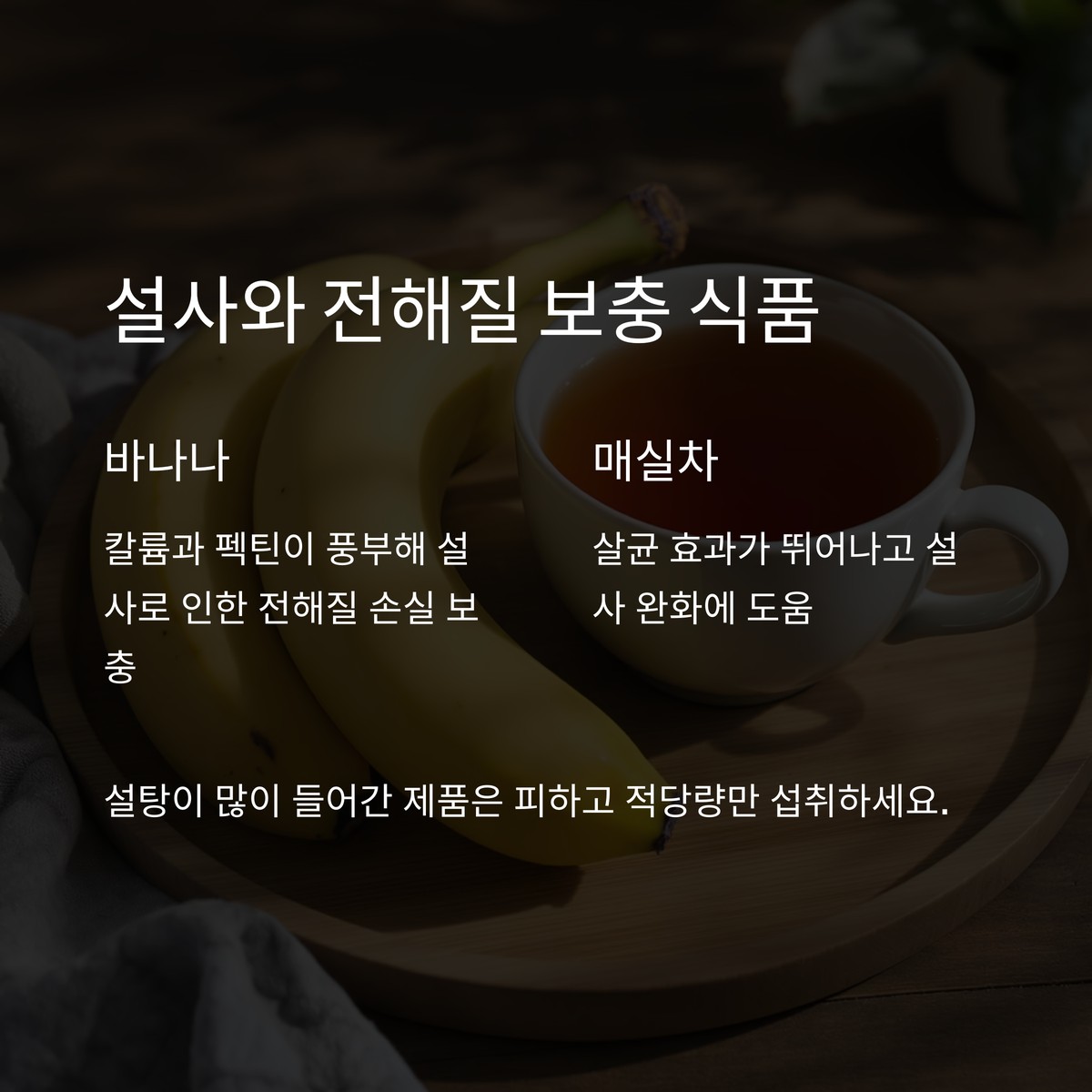 | 바나나, 매실차 | 전해질 보충, 설사 완화, 장 진정 |