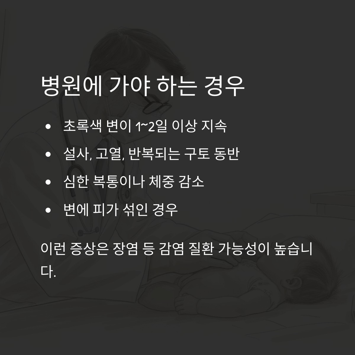 아기 또는 성인 모두에서 초록색 변이 1~2일 이상 지속되면서 설사, 고열, 반복되는 구토, 심한 복통, 체중 감소, 변에 피가 섞인 경우에는 장염 등 감염 질환 가능성이 높으므로 반드시 의료진의 진료를 받아야 합니다.