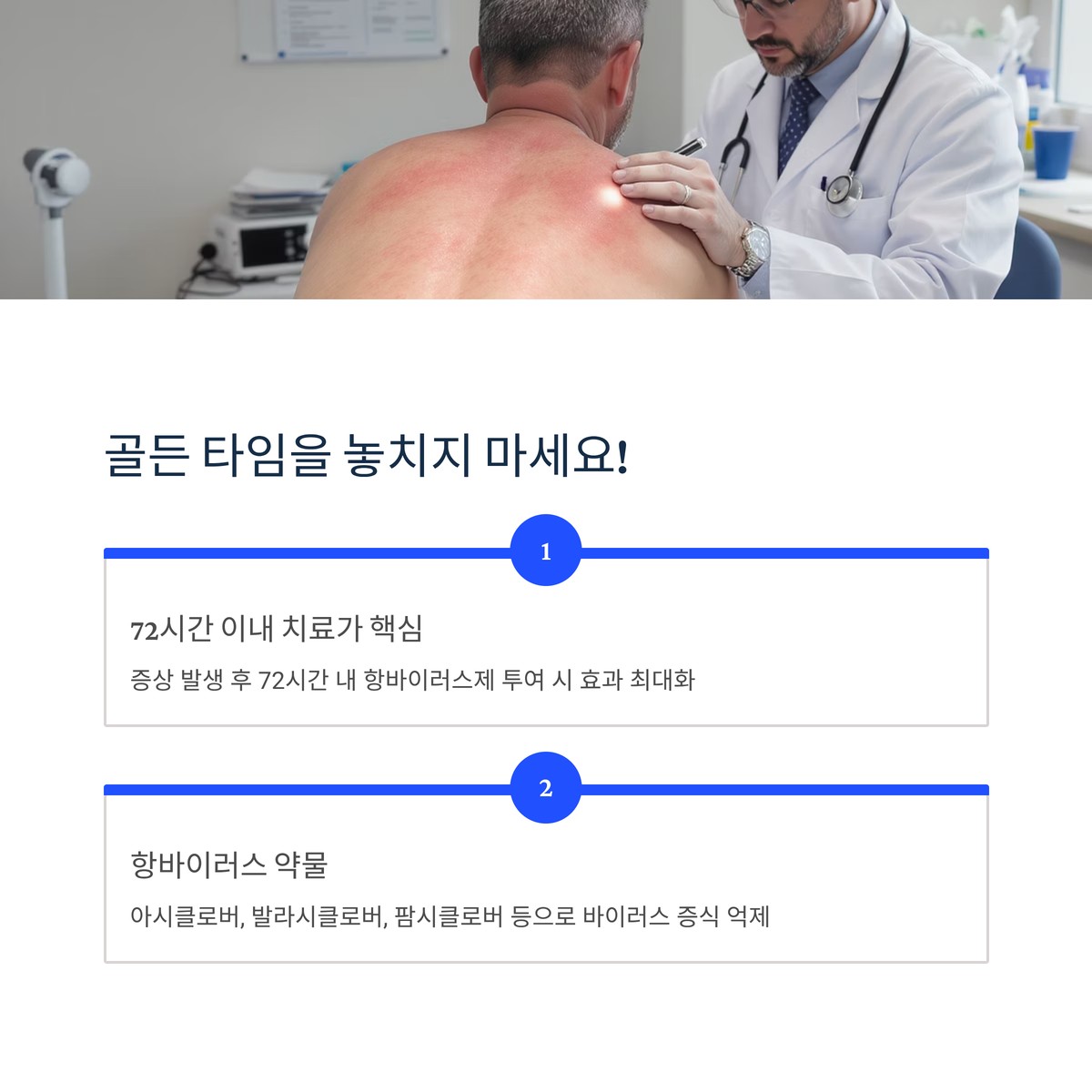 - 가장 중요한 유의점: 증상이 나타난 후 72시간 이내에 약을 투여해야 효과가 가장 좋다는 사실! 이걸 바로 '골든 타임'이라고 불러요. 통증이나 이상 감각이 느껴지면 절대 망설이지 말고 바로 병원에 가셔야 하는 이유죠.