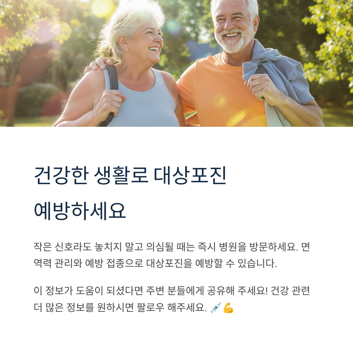 오늘은 대상포진의 초기 증상부터 치료, 그리고 예방까지 자세히 알아봤어요. 가장 중요한 건 내 몸의 작은 신호라도 놓치지 않고, 의심될 때는 주저하지 말고 병원에 방문하는 것이라는 점! 잊지 마세요. 미리미리 예방하고 건강하게 생활해서 이 무서운 질병을 잘 이겨내시길 바랍니다. 혹시 더 궁금한 점이 있다면 언제든지 댓글로 물어봐 주세요~ 😊
