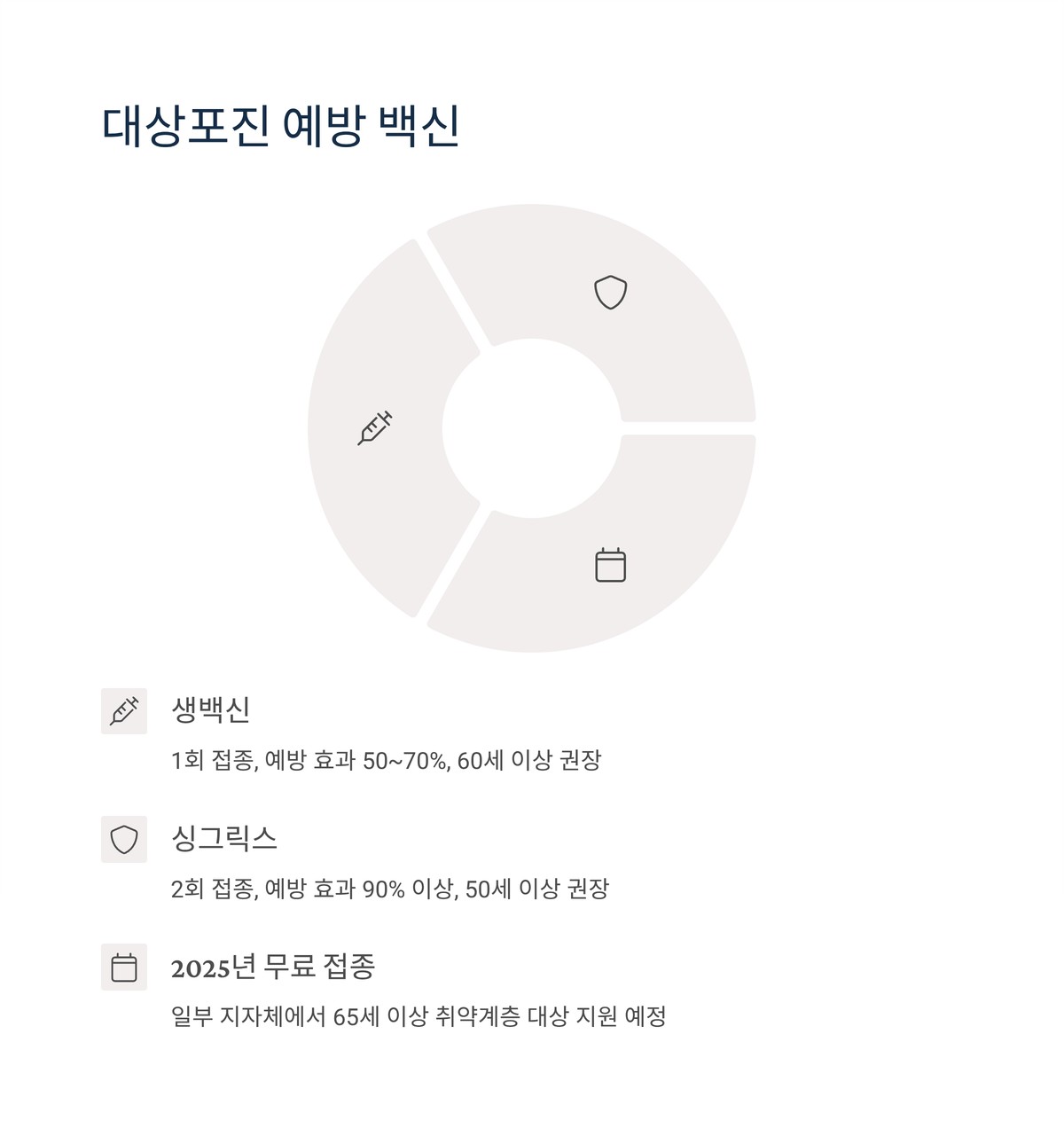 - '싱그릭스' 백신: 요즘 떠오르는 백신이죠! 2회 접종으로 90% 이상의 훨씬 높은 예방 효과를 보여준다고 해요. 50세 이상에게 권장되며, 재발률도 더 낮다고 하니 정말 반가운 소식이죠.