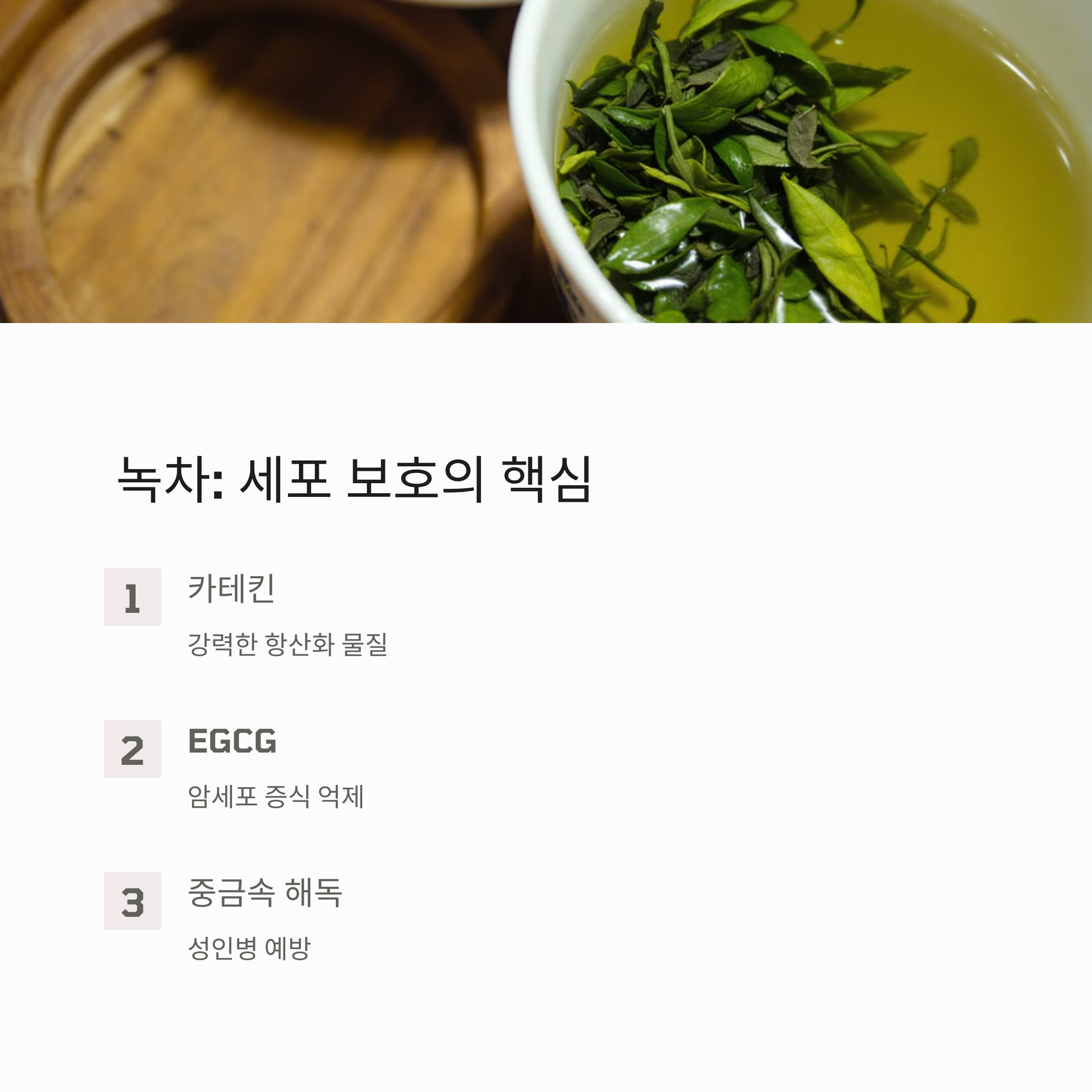 녹차는 카테킨(Catechin)이라는 강력한 항산화 성분을 포함하고 있어 세포 손상을 방지하고 암세포의 성장을 억제하는 데 도움을 줍니다. 특히, EGCG(에피갈로카테킨 갈레이트)라는 성분은 발암 물질을 차단하고 신체의 면역력을 높이는 역할을 해요.