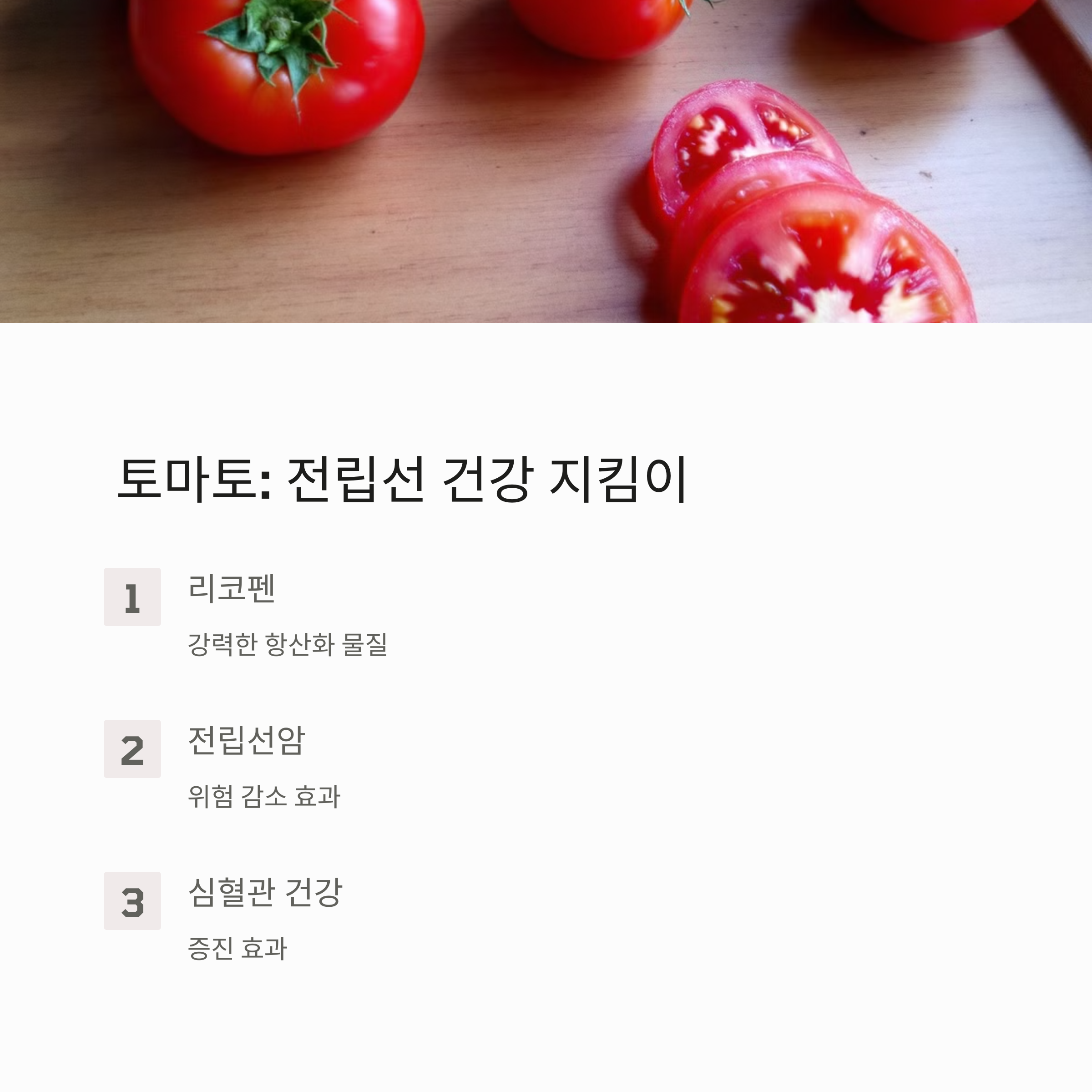 토마토에는 라이코펜(Lycopene)이라는 강력한 항산화 성분이 풍부하게 들어 있어요. 이 성분은 특히 전립선암 예방에 탁월한 효과를 발휘한다고 알려져 있습니다.