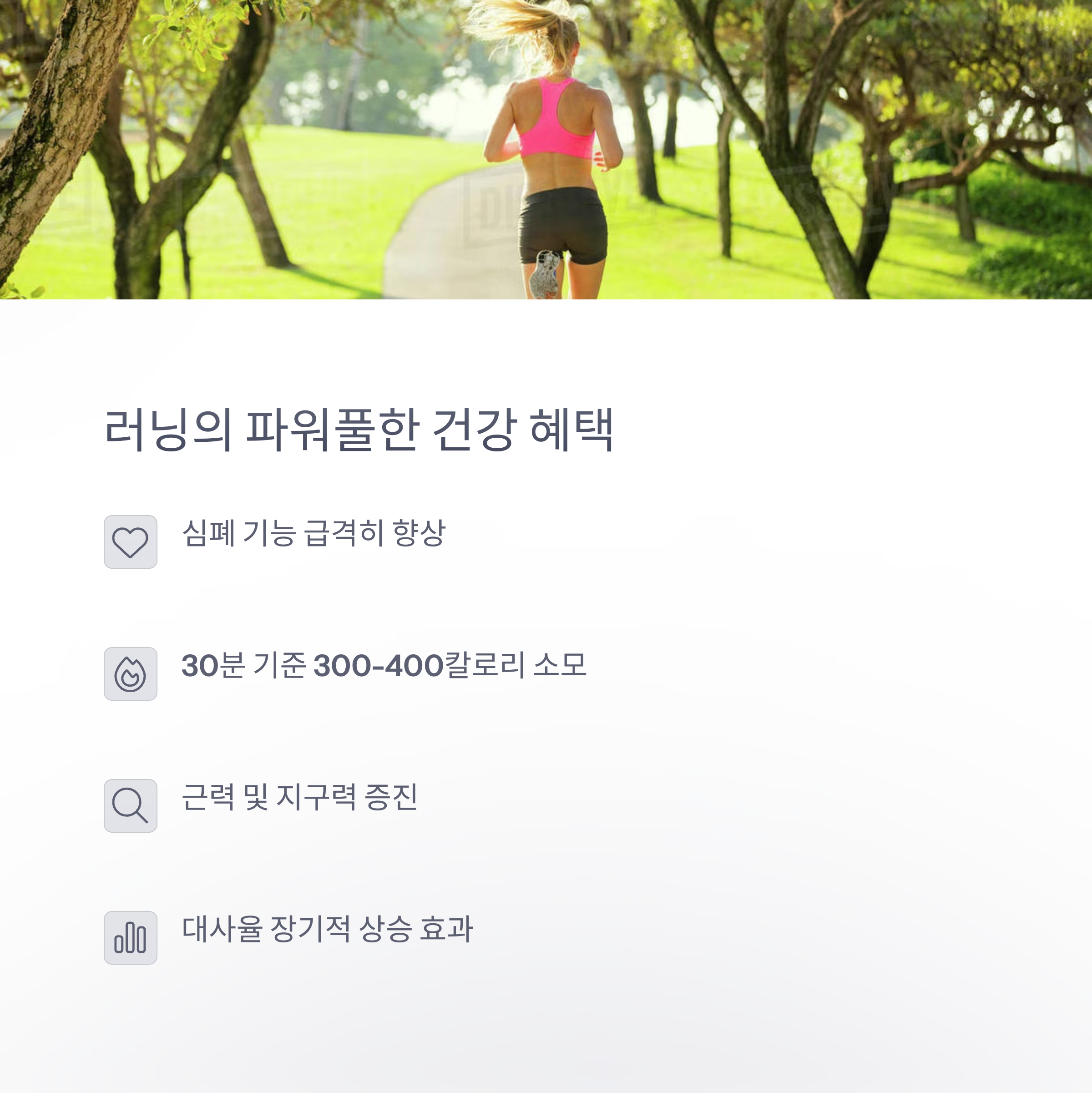 | 러닝의 장점 | 짧은 시간 안에 높은 칼로리 소모와 심폐 강화 효과를 줍니다. |