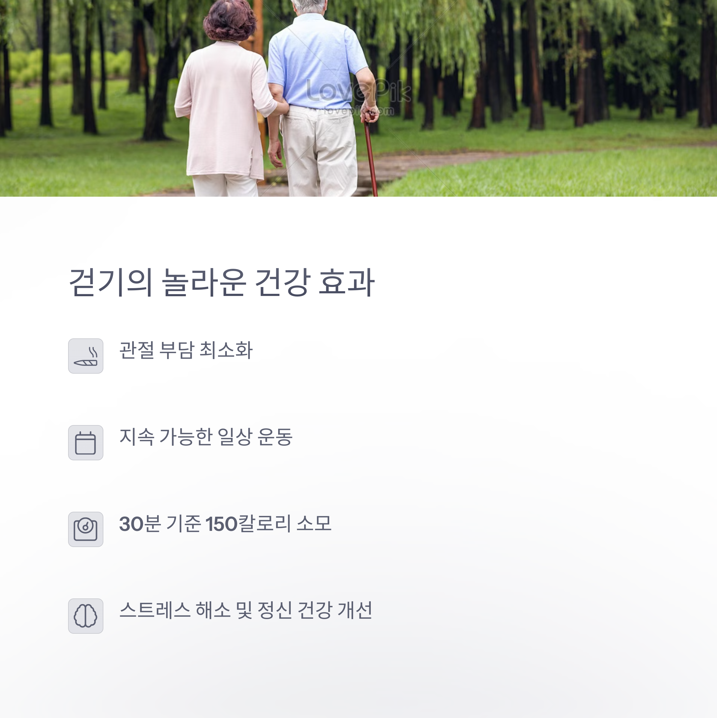 | 걷기의 특징 | 관절 부담이 적고 지속 가능한 저강도 운동입니다. |