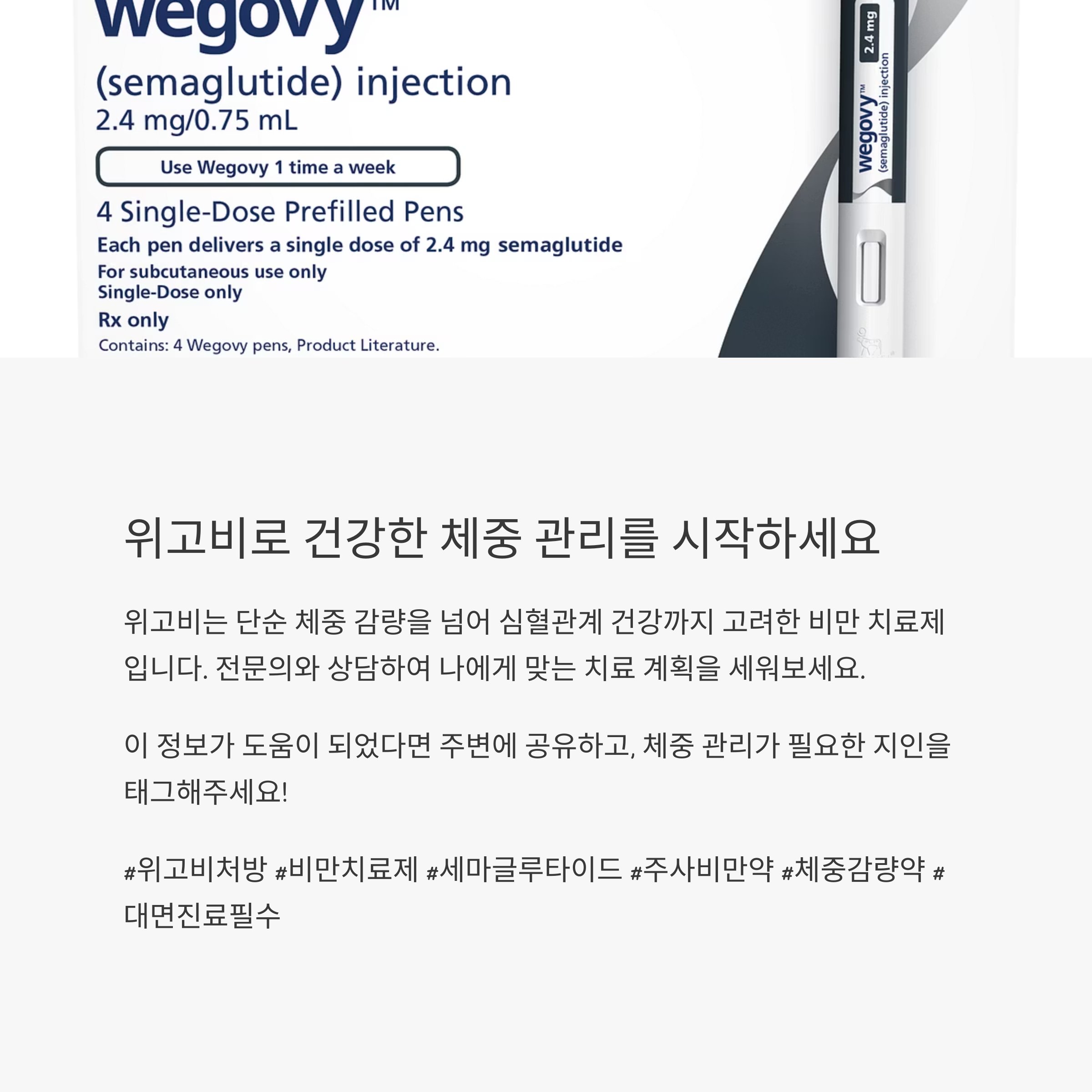 위고비(Wegovy)는 주 1회 피하주사로 투여하는 전문 비만 치료제입니다.