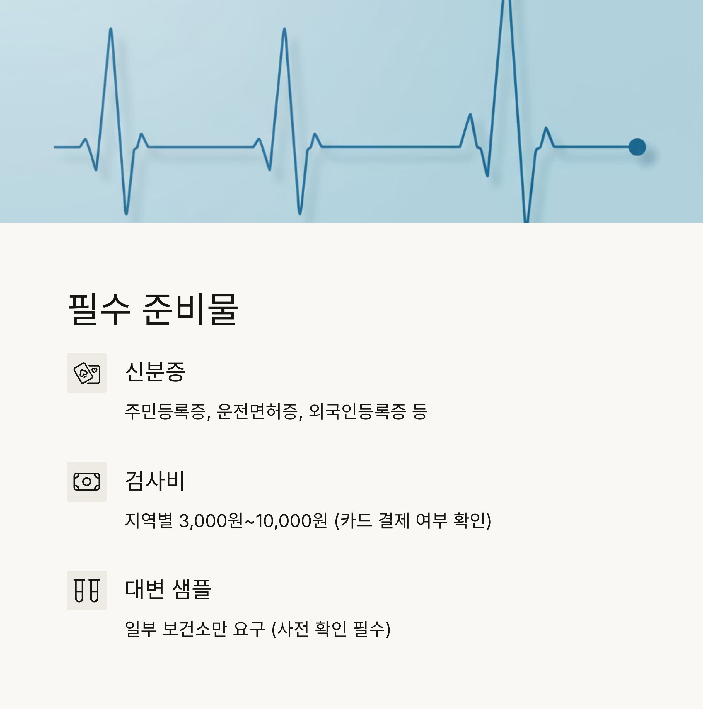 "필수 준비물은 신분증과 검사비! 대변은 미리 확인 후 준비하세요."
