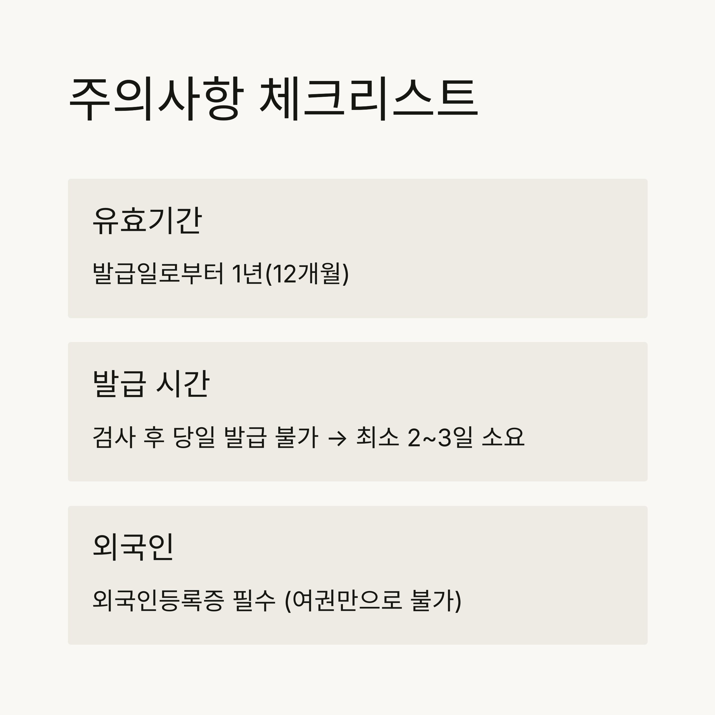 - 검사 후 당일 발급 불가 → 최소 2~3일 소요