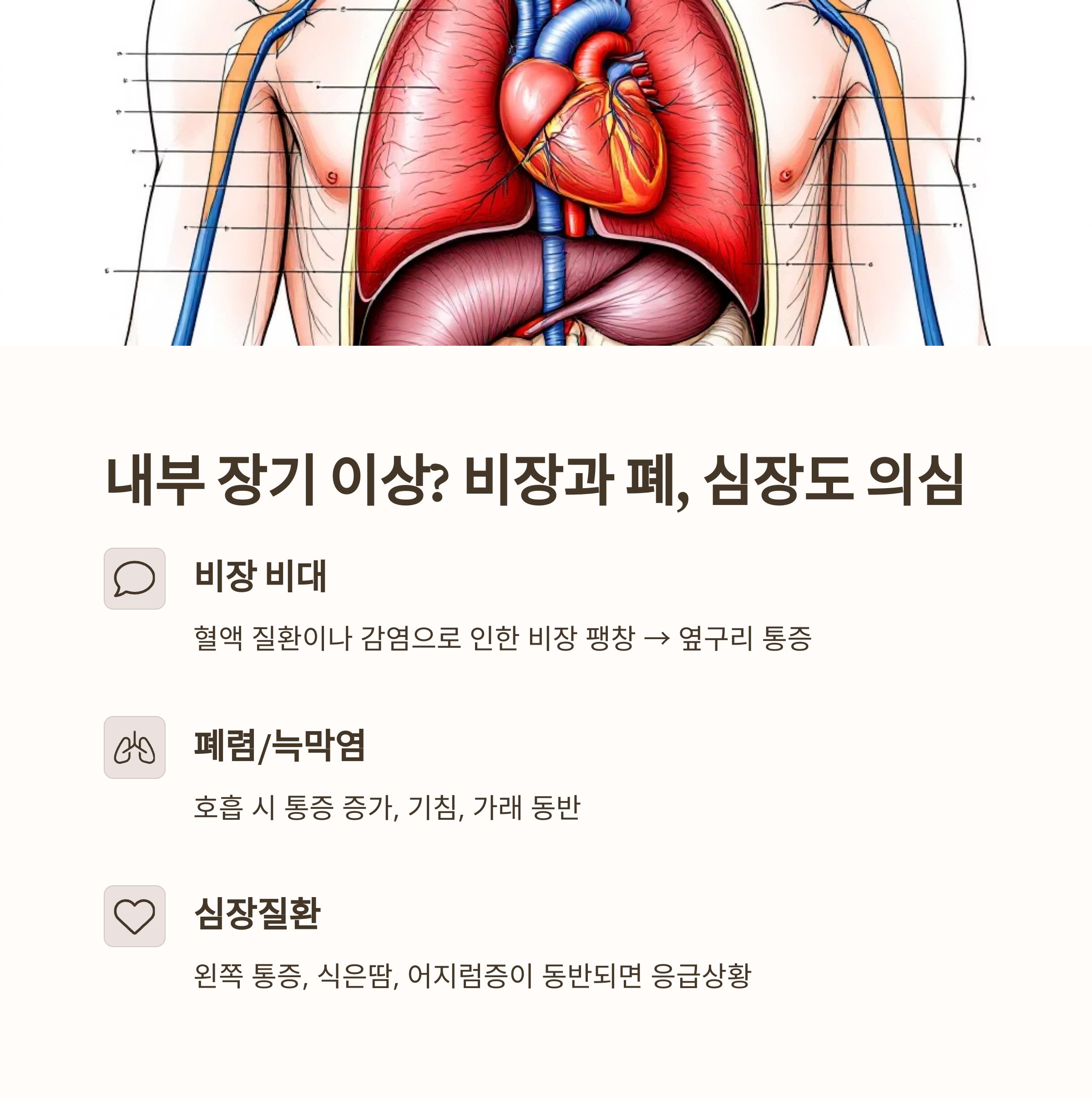 - 비장 비대: 혈액 질환이나 감염으로 인한 비장 팽창 → 옆구리 통증